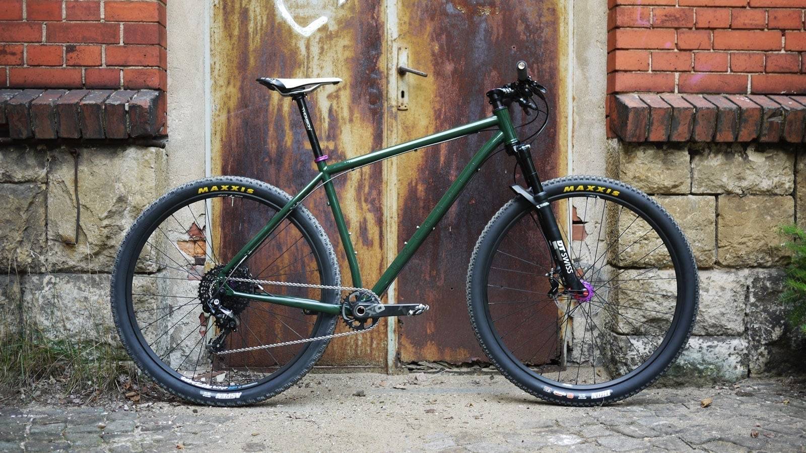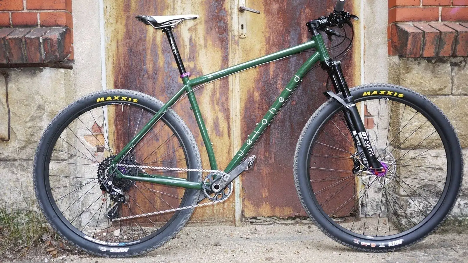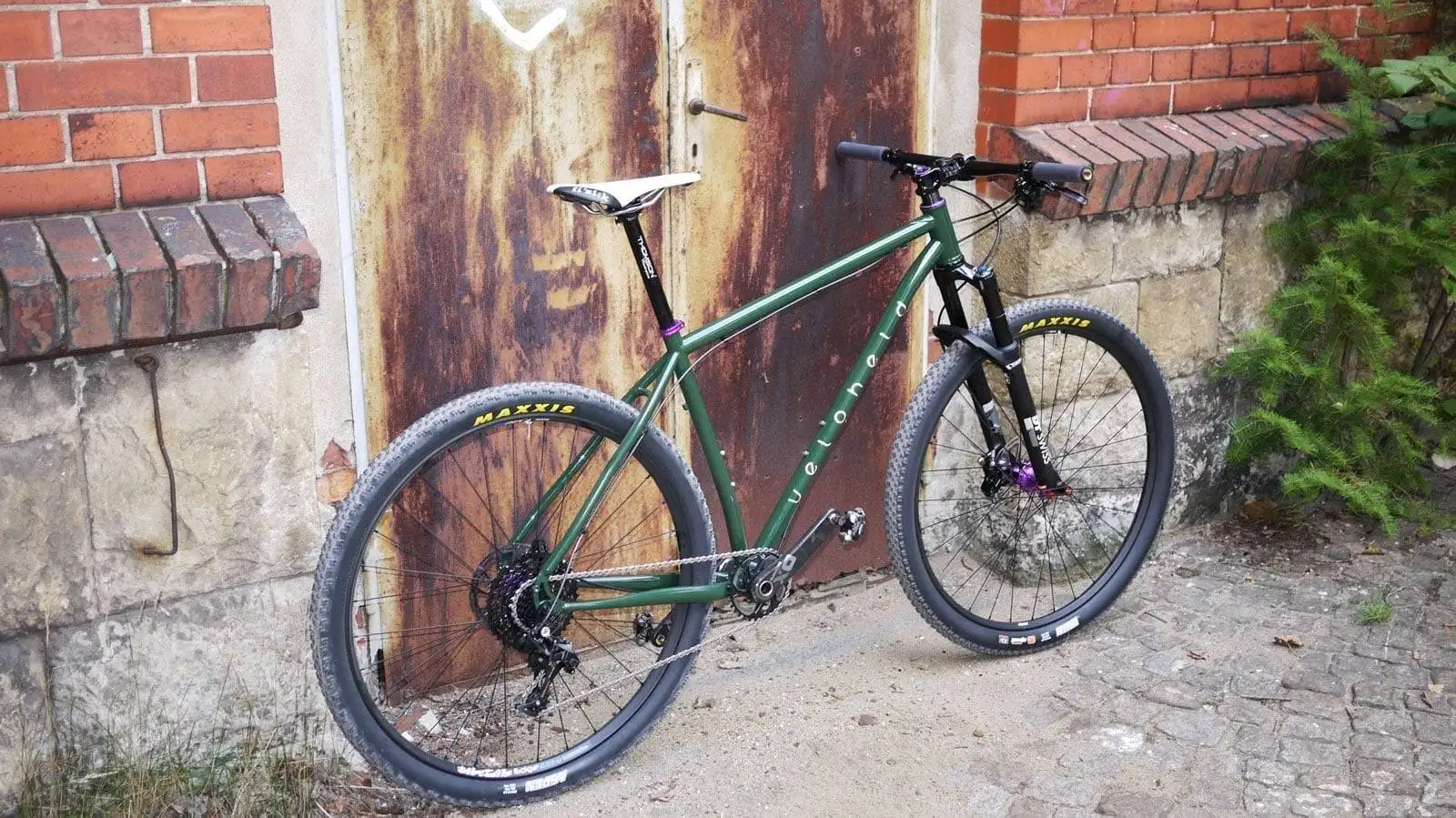A crazy combination – diese 29er veloheld.iron MTB bekam eine tannengrüne Beschichtung (RAL 4009) mit schwarz reflektierenden Dekoren. Aufgebaut wurde der Rahmen dann mit purple eloxierten Teilen von Hope, Reset Racing usw.. Eine ungewöhnliche Farbkombination. Oftmals kann man sich solche Variationen nicht vorstellen, aber umso mehr freuen wir uns aber über solche „verrückten“ Projekte.