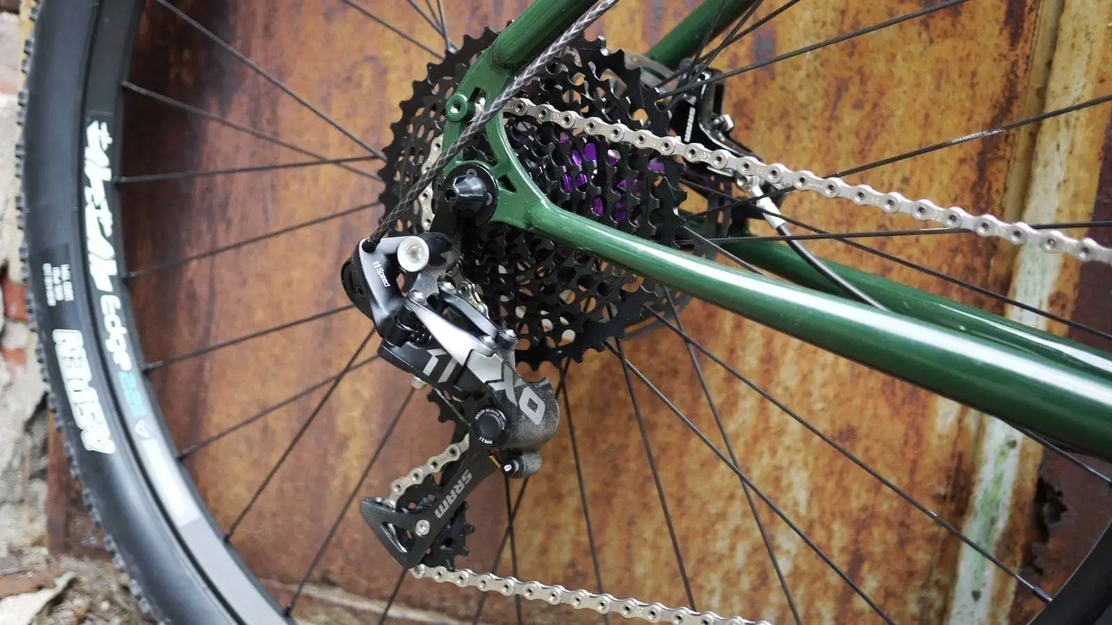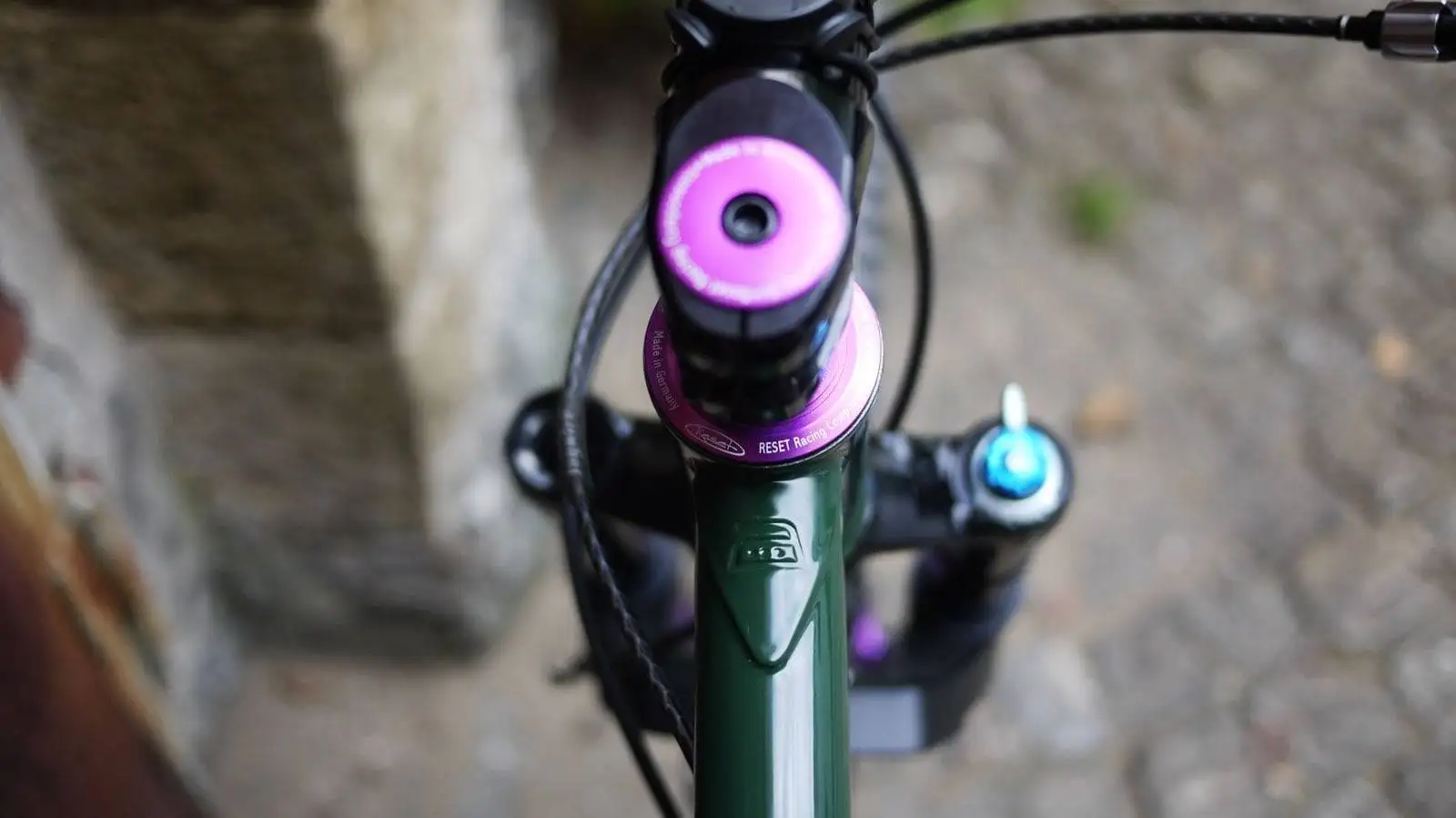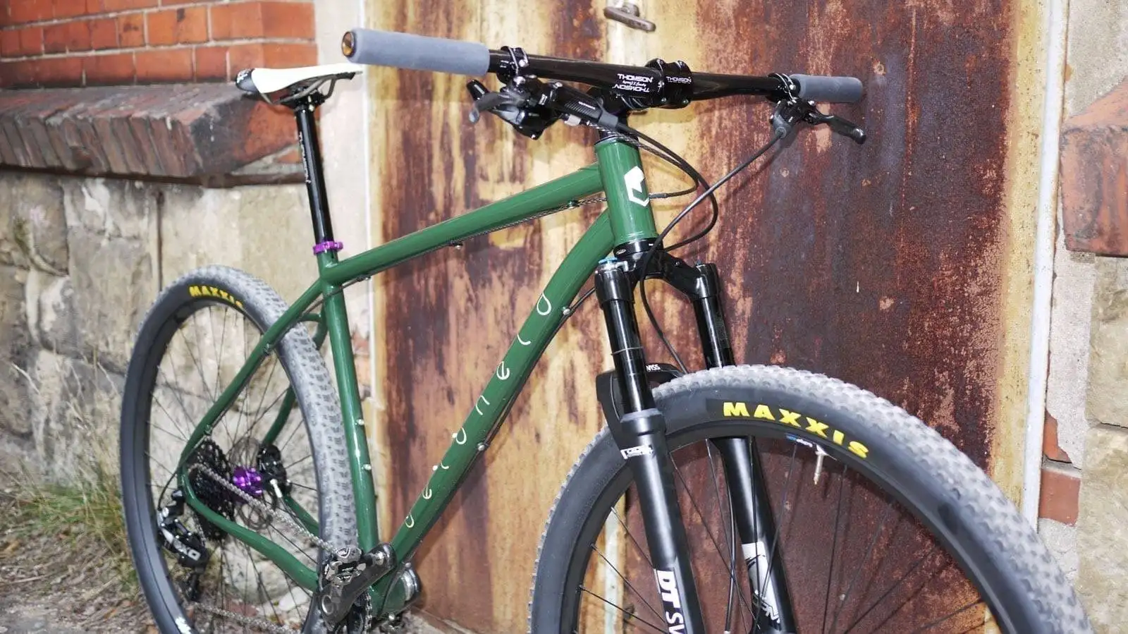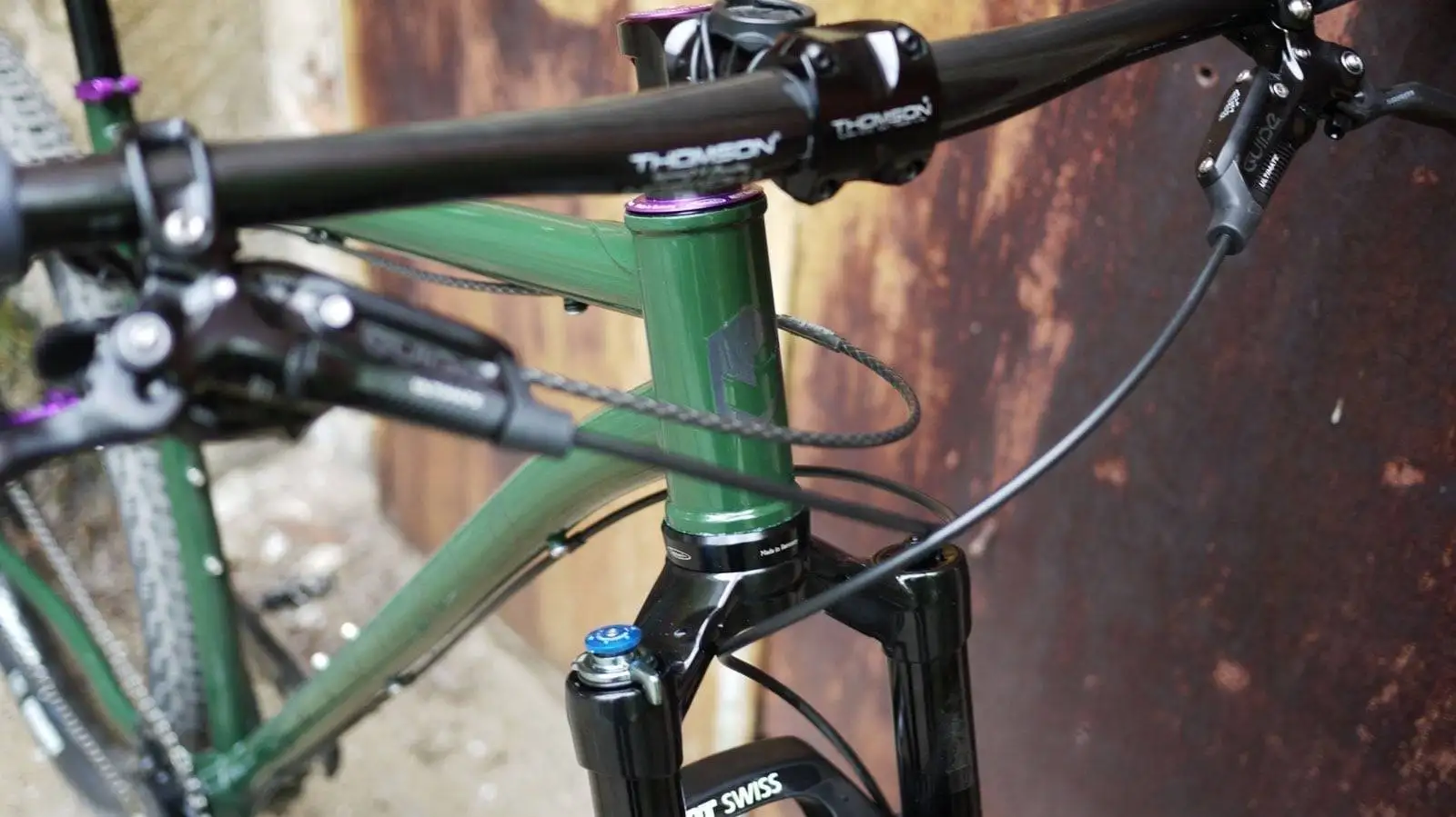 A crazy combination – diese 29er veloheld.iron MTB bekam eine tannengrüne Beschichtung (RAL 4009) mit schwarz reflektierenden Dekoren. Aufgebaut wurde der Rahmen dann mit purple eloxierten Teilen von Hope, Reset Racing usw.. Eine ungewöhnliche Farbkombination. Oftmals kann man sich solche Variationen nicht vorstellen, aber umso mehr freuen wir uns aber über solche „verrückten“ Projekte.