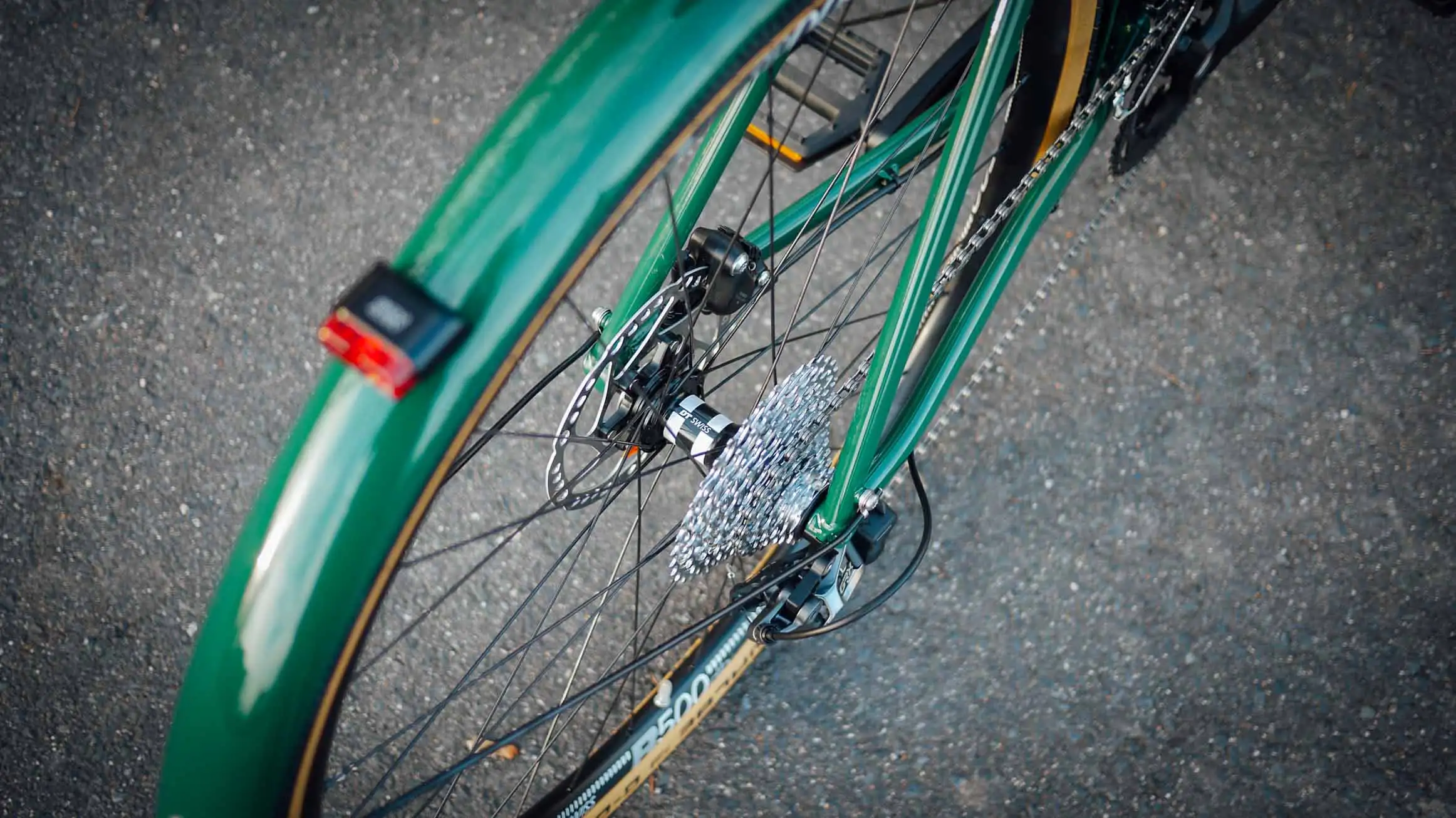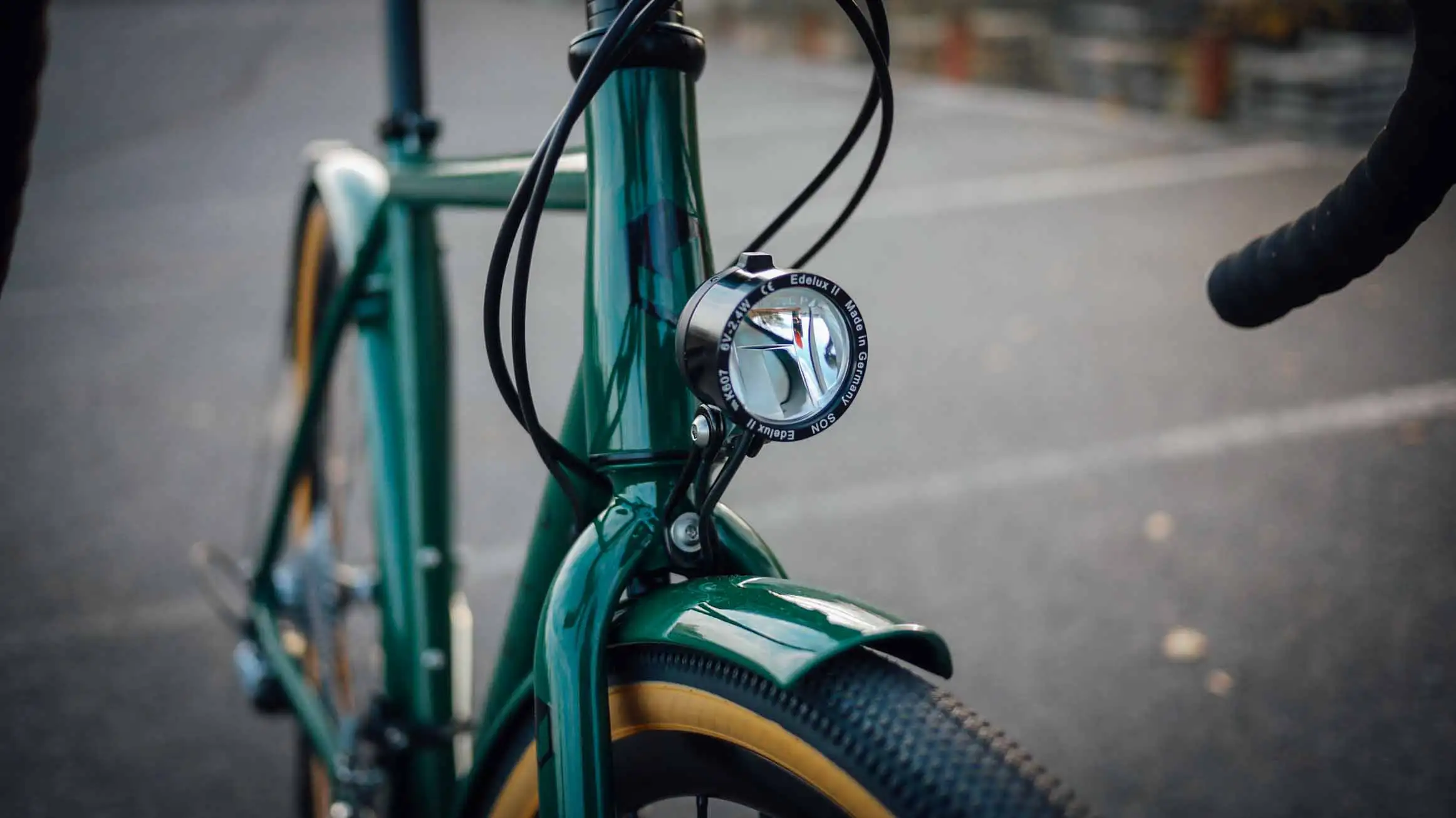 Moosgrün ist die Farbe der Woche! Diese gab es für das oben gezeigte veloheld.iconX Gravelbike nicht nur für Rahmen und Gabel, sondern auch für die Schutzbleche. Gerade jetzt in der oft nassen Jahreszeit ein riesiger Vorteil, wenn man das Rad auch für die tägliche Arbeitsfahrt nimmt. Und falls man nach der Arbeit noch einen Umweg fahren möchte, sollte eine Beleuchtung nicht fehlen. Am besten mit einem immer einsatzbereiten Nabendynamo und Lichtanlage von SON, wie Ihr am Rad sehen könnt.