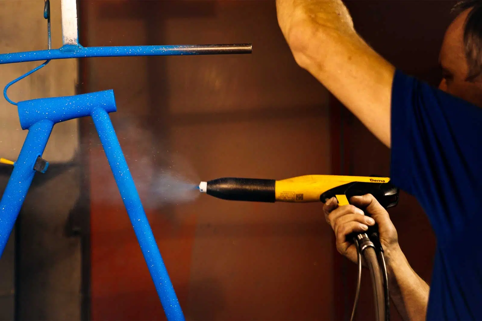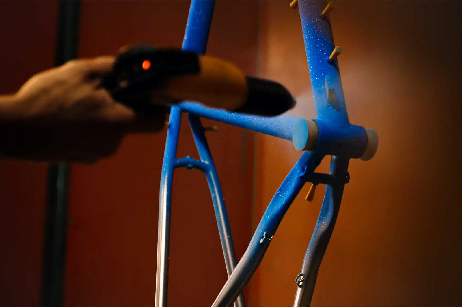 Mit dem veloheld.iconX Frameset stand die Basis. Nun musste nur noch die passende Farbe aus abertausenden Varianten gewählt werden. “Disco Red”, “Illusion Gambler” oder “Apollo Gold” – die Namen der Pulverlacke allein erzählen schon Geschichten genug – dabei müssen die Abenteuer mit den Bikes erst noch von ihren neuen Besitzern erlebt werden. Am Ende des schwierigen Farbfindungsprozesses wurde es dann die Prismatic Powders Farbe “Blue Madness”. Denn ein bisschen Wahnsinn gehört in fast jeden Trip.