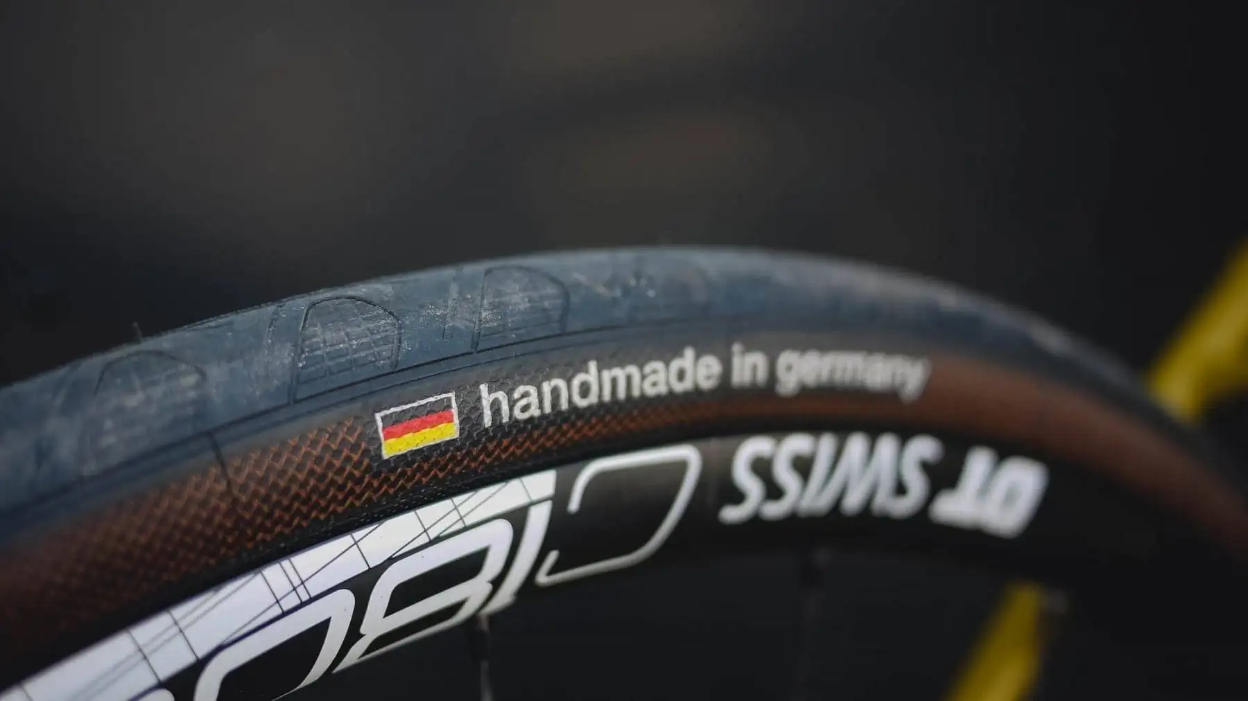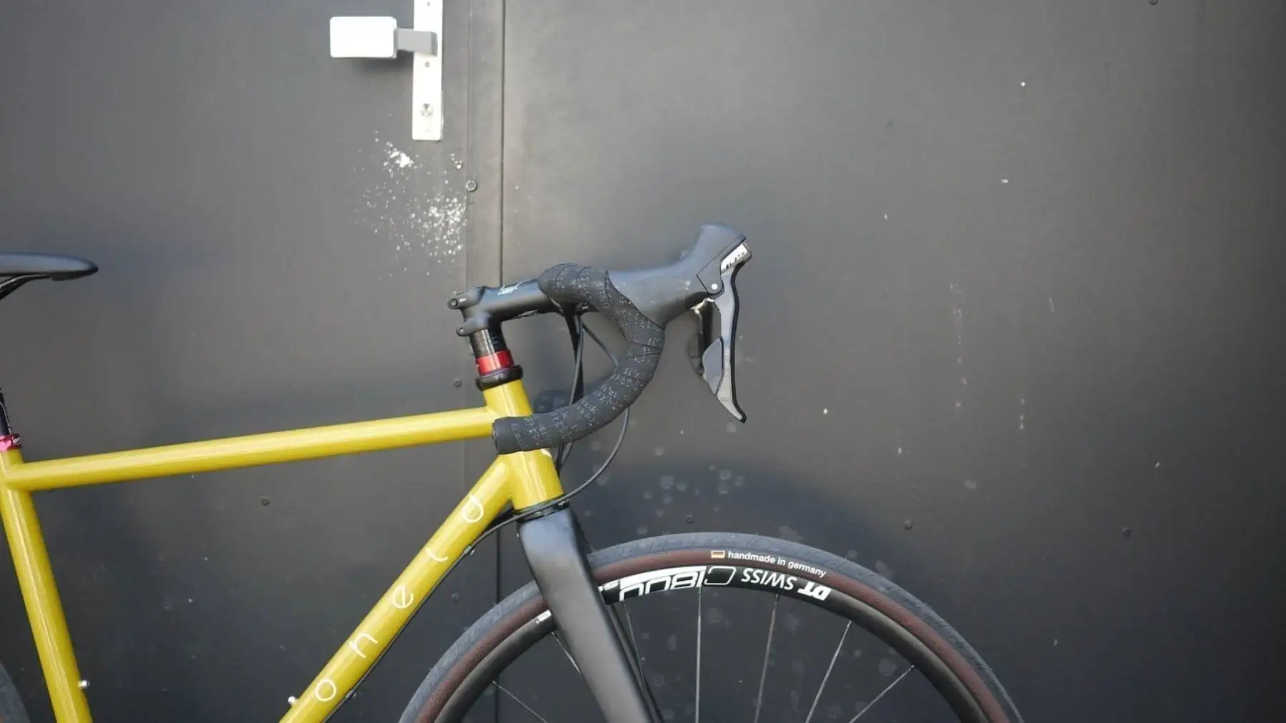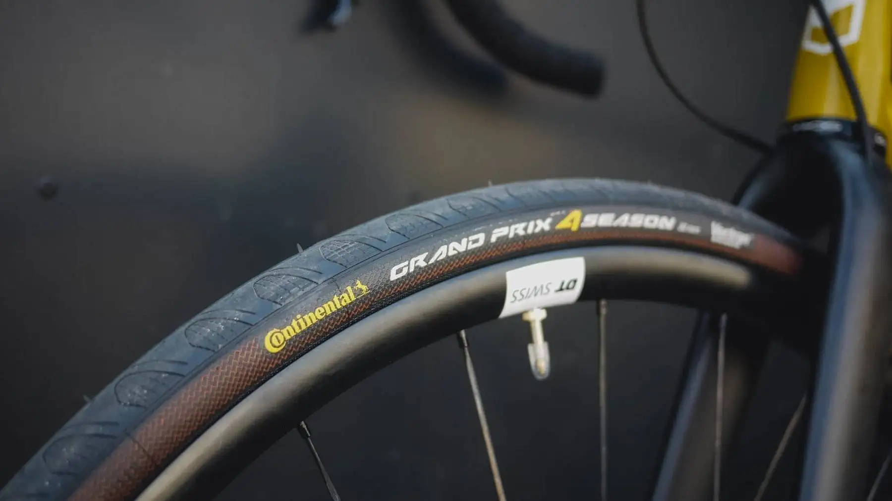 Ok, jetzt können wir uns einmal genauer die Ausstattung dieses Wunsch-Rades in der Farbe Currygelb (RAL1027) mit weißen Dekoren anschauen. Fangen wir also bei den Reifen an. Bei diesem veloheld.iconX Rad in Größe S haben also die Continental Grand Prix 4 Seasons Reifen komfortable 32 mm Breite auf den breiten DT Swiss C1800 Spline Laufrädern.
