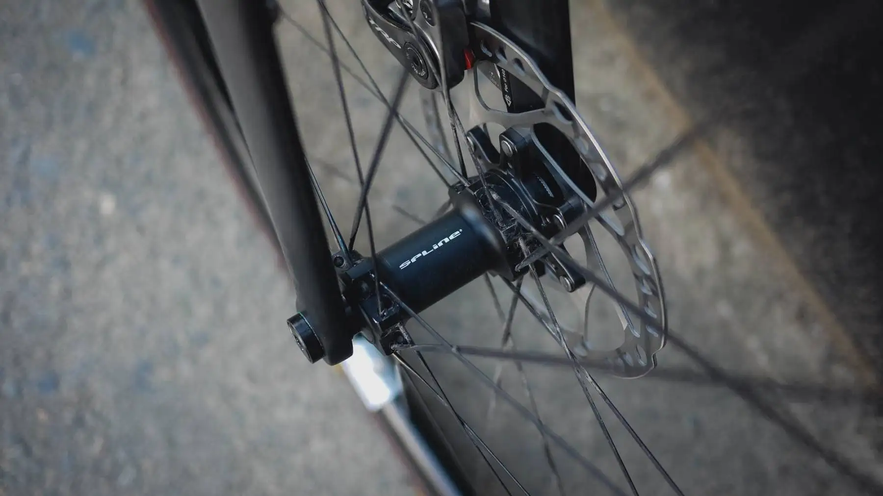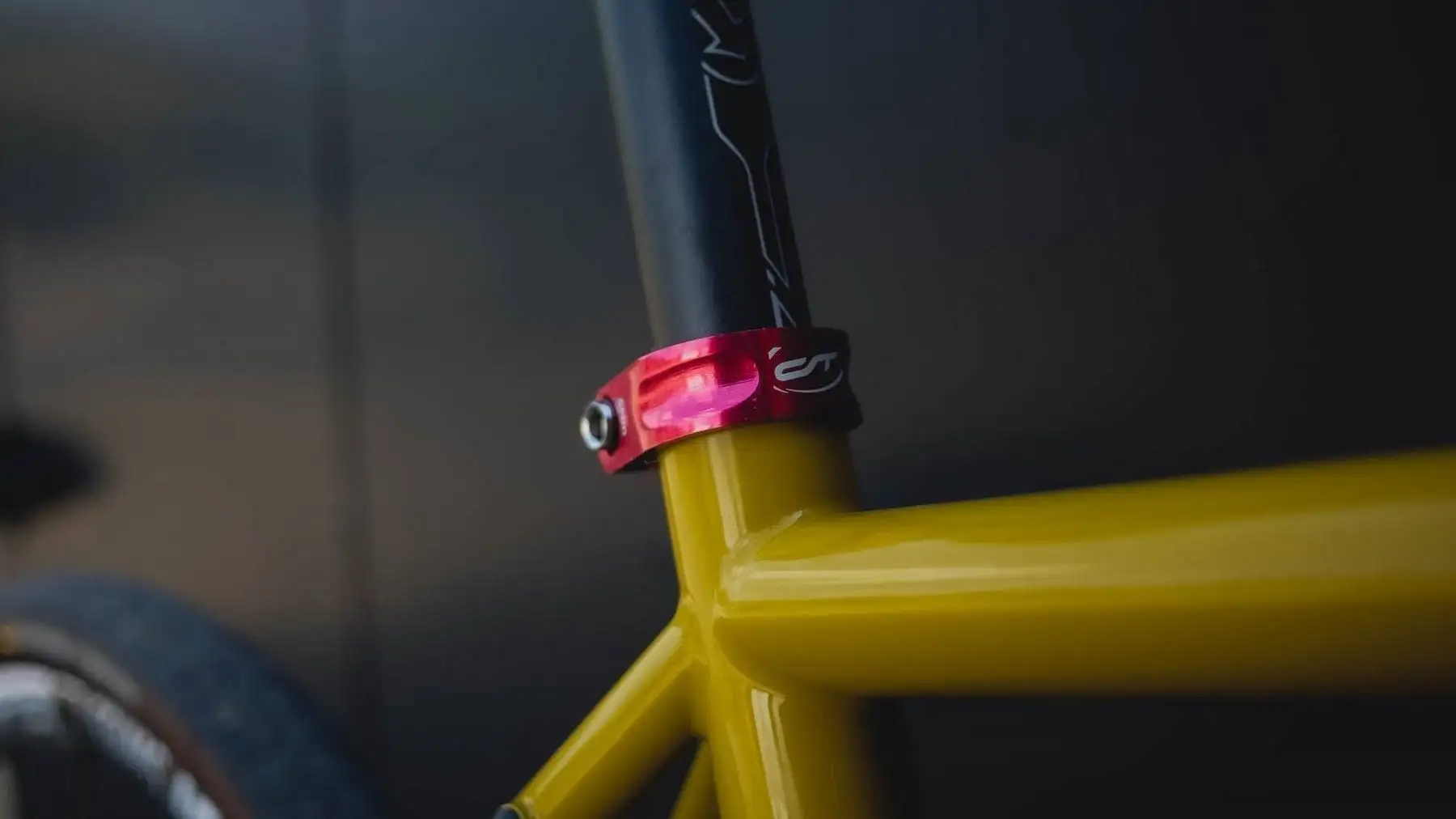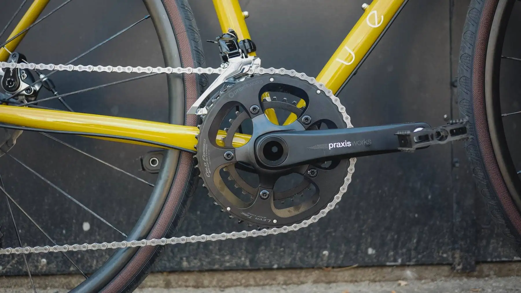 Statt der oft verwendeten Stahlgabel gab es hier die leichtere veloheld.Carbongabel. Die Shimano 105 2×11 Schaltgruppe bekam eine mechanische TRP Spyre Scheibenbremse an die Seite. Auch die formschöne Kurbel kommt nicht von Shimano, sondern von Praxis Works und hört auf den Namen „Alba“. Und als einen kleinen farblich kontrastierenden Akzent gab es eine rot eloxierte Sattelklemme und zwei Spacer.