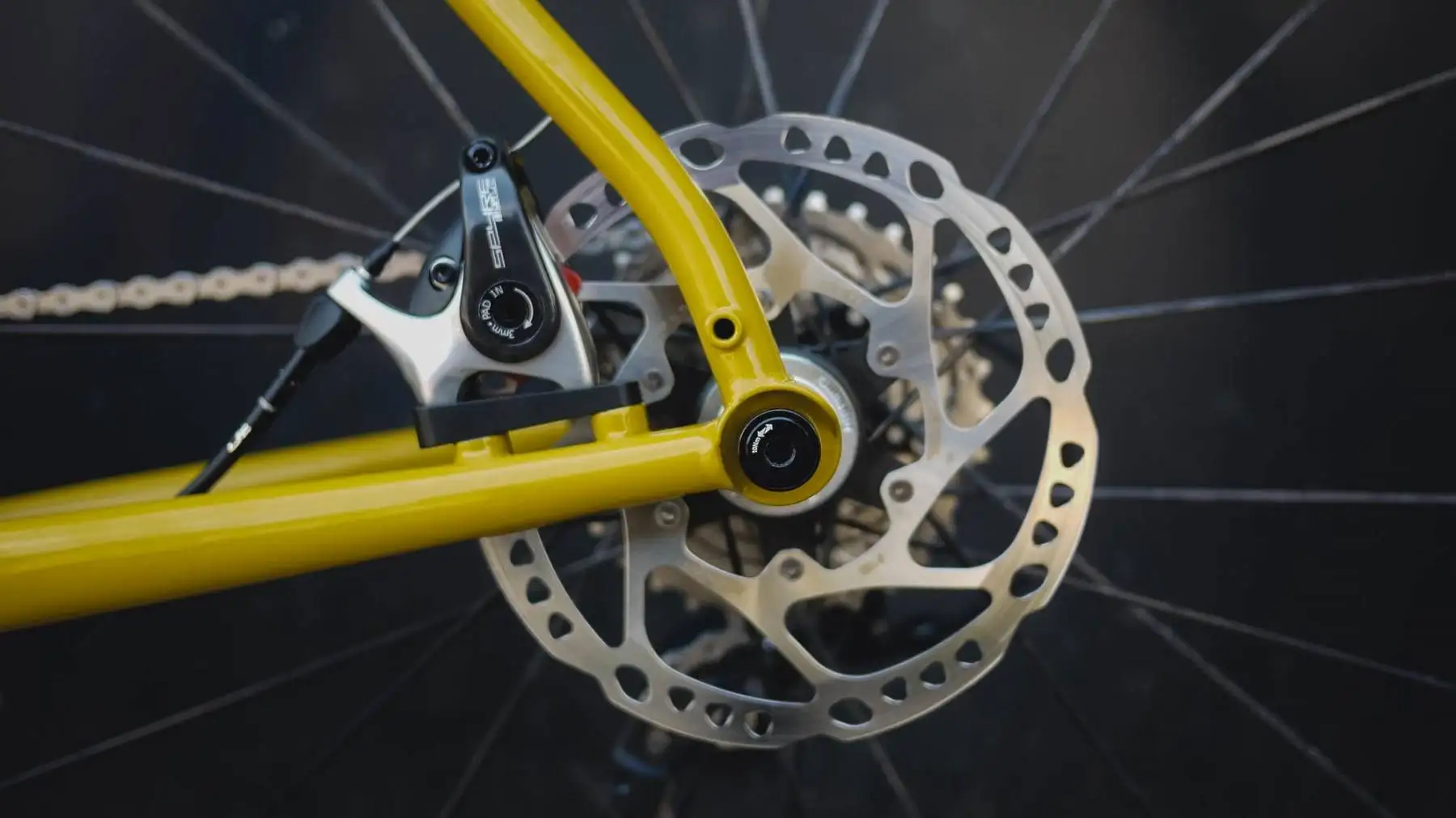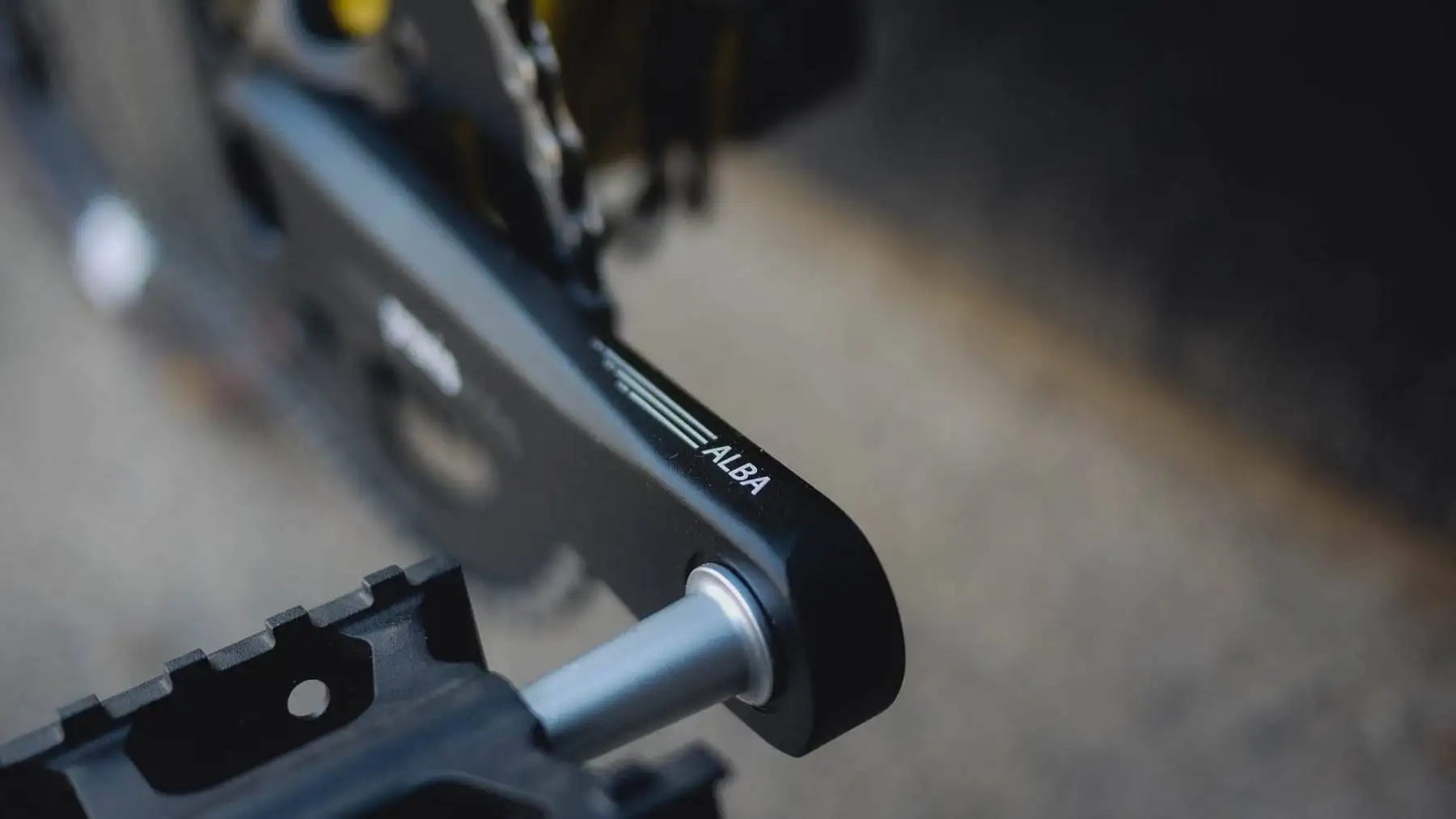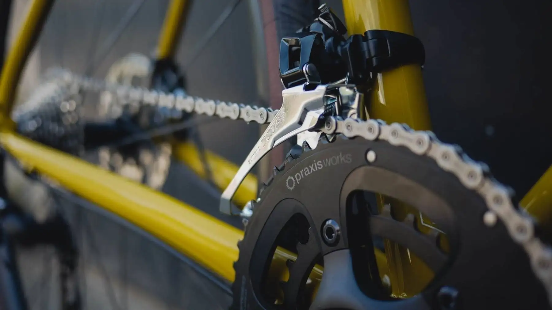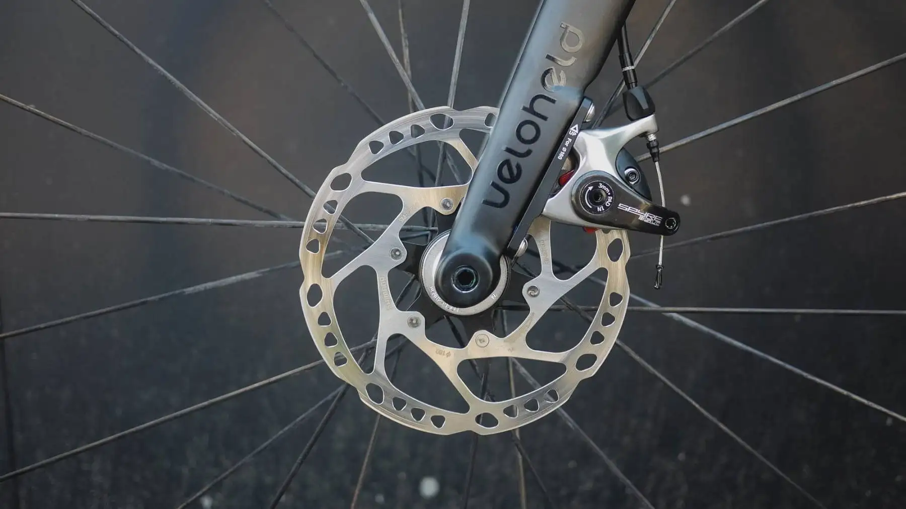 Statt der oft verwendeten Stahlgabel gab es hier die leichtere veloheld.Carbongabel. Die Shimano 105 2×11 Schaltgruppe bekam eine mechanische TRP Spyre Scheibenbremse an die Seite. Auch die formschöne Kurbel kommt nicht von Shimano, sondern von Praxis Works und hört auf den Namen „Alba“. Und als einen kleinen farblich kontrastierenden Akzent gab es eine rot eloxierte Sattelklemme und zwei Spacer.
