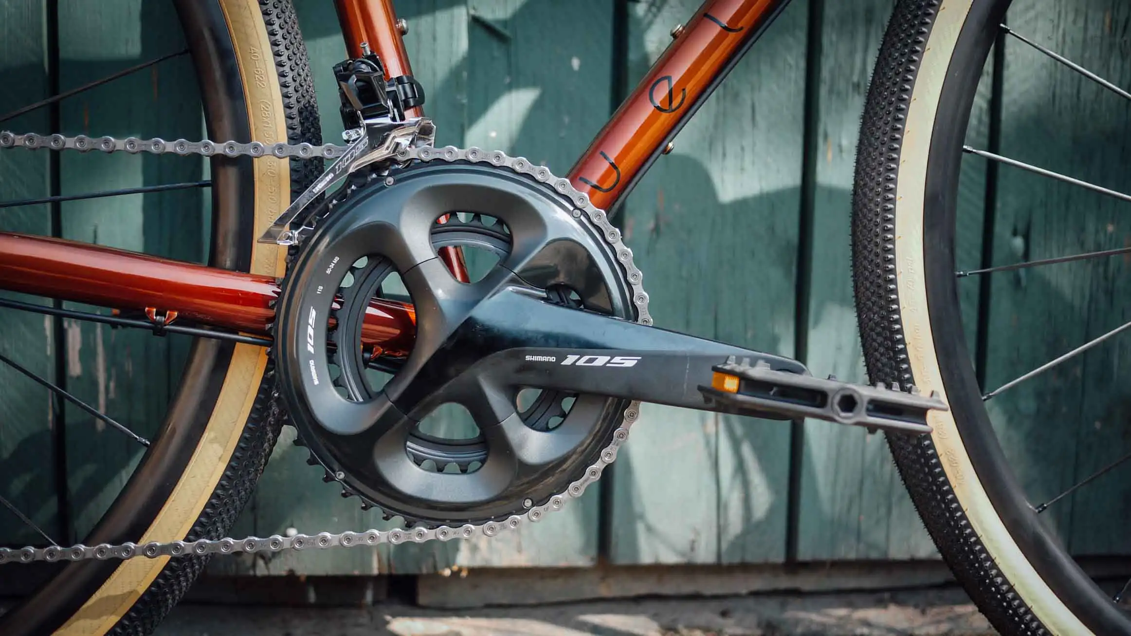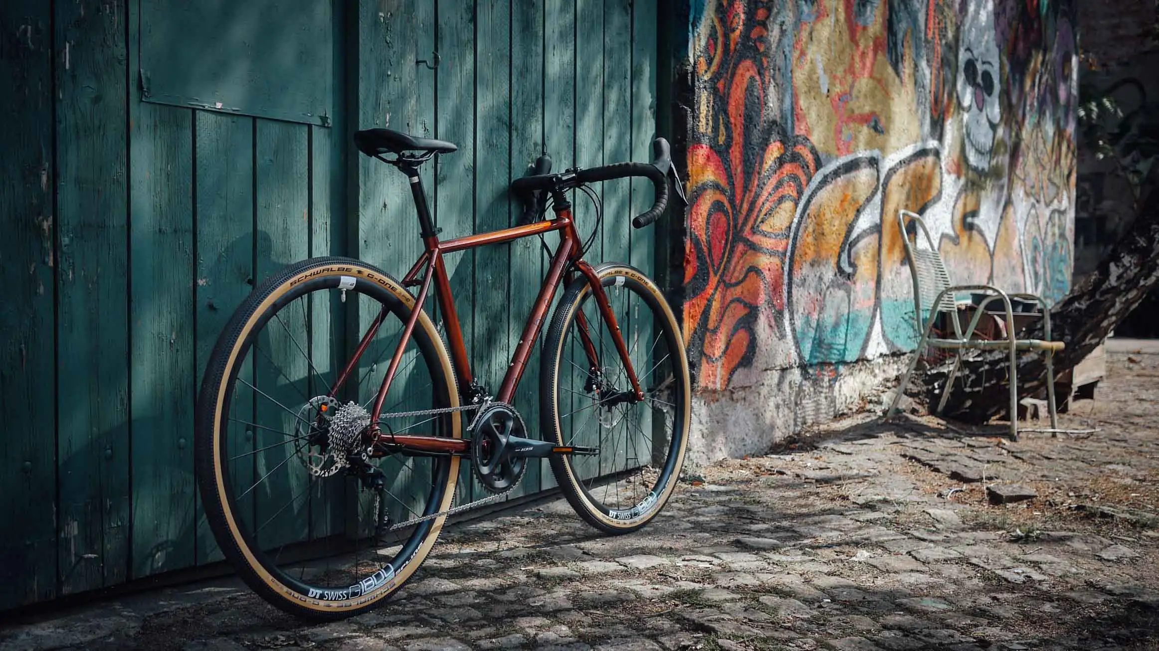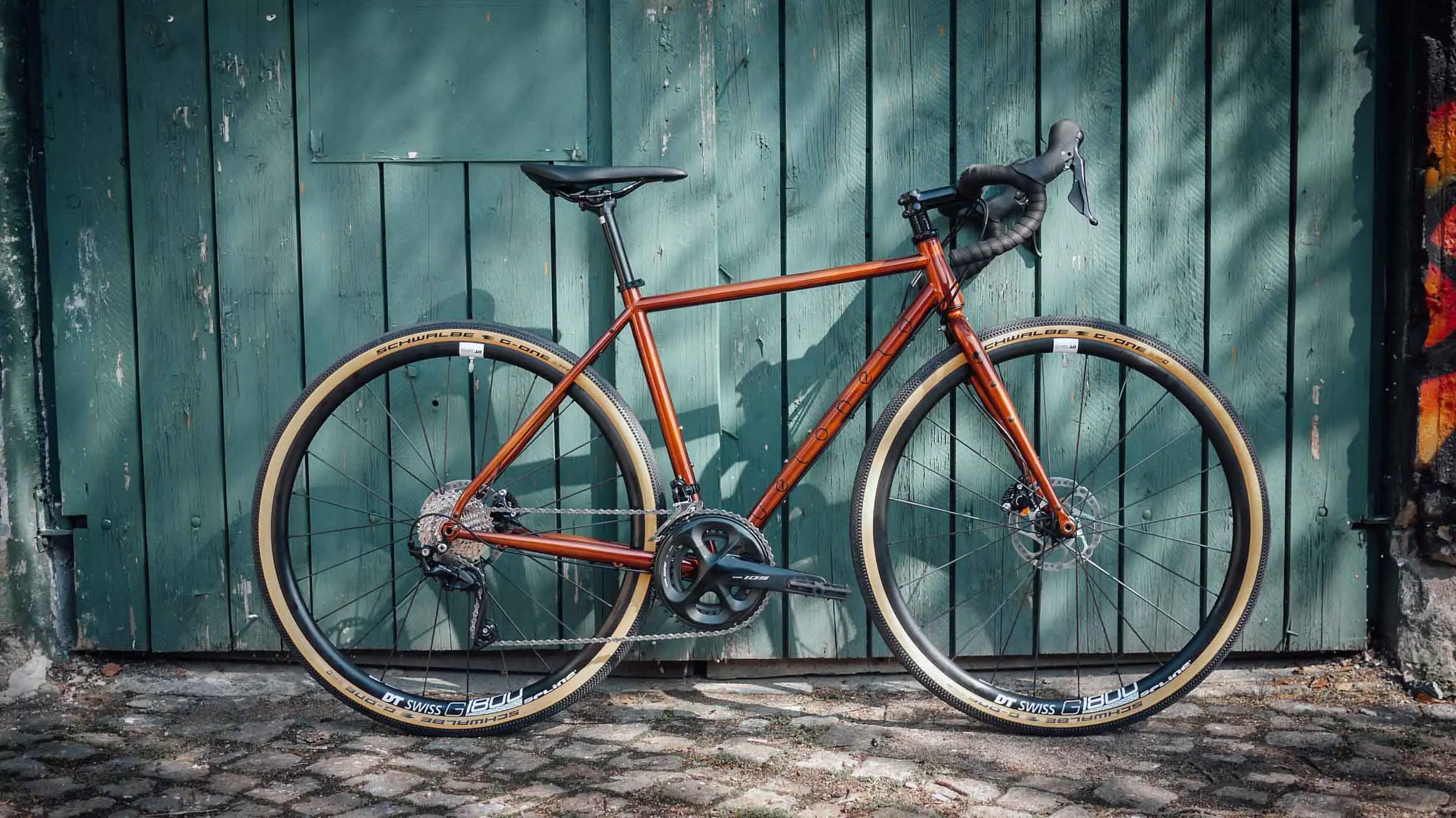 Aufgebaut wurden Rahmen und Gabel aus wärmebehandelter CroMo-Stahllegierung mit der Shimano 105 2×11 Schaltgruppe und unseren hauseigenen veloheld Komponenten. Damit es immer rund läuft, drehen sich die neuen DT Swiss G1800 Gravellaufräder mit den schönen Schwalbe G-One Reifen mit Classic Skin oder auch Skinwall genannt.