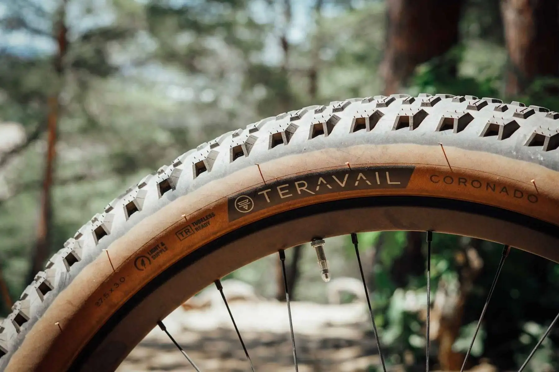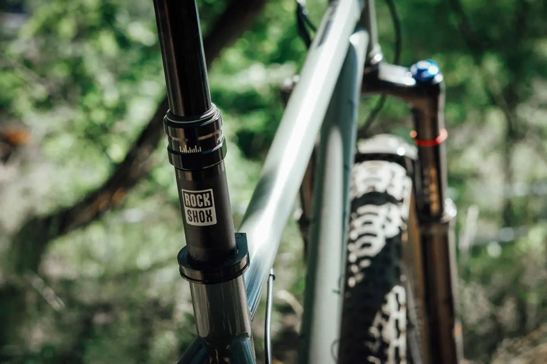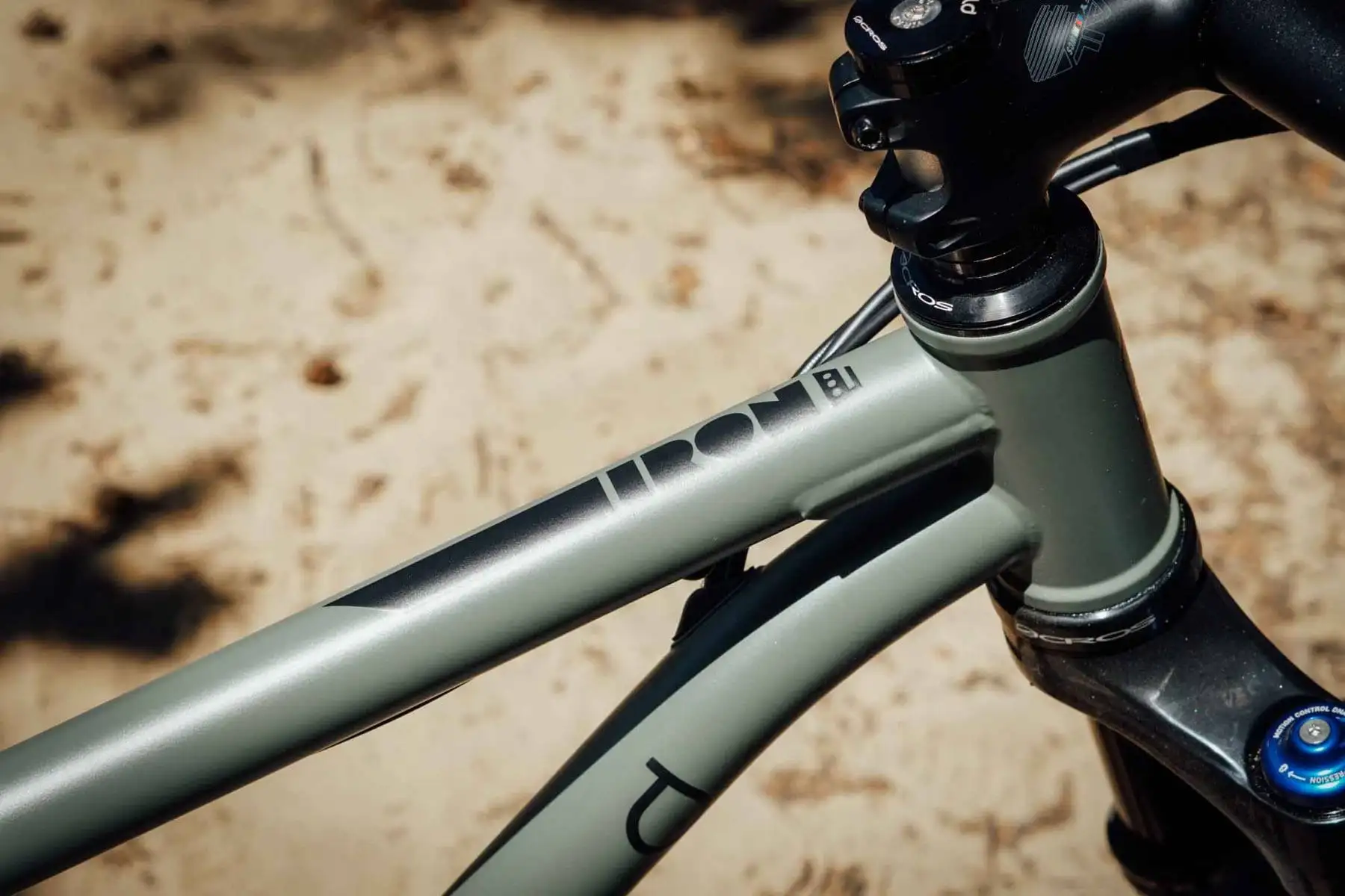 Der Rahmen wurde, wie bereits weiter oben erwähnt, in der wunderschönen Farbe Grüngrau (RAL 7009) gepulvert. Auf den Fotos sieht man es nicht so richtig, aber das Finish ist ein Übergang von einem matten zu einem glänzenden Klarlack. Sicherlich wäre der Effekt bei einem dunkleren Basis-Farbton noch ein wenig mehr zur Geltung gekommen. Die 27.5″ Laufräder wurden mit dem extrem leisen Shimano SLX Freilauf an der Hinterradnabe von den Dresdner Laufradexperten von Light-Wolf gebaut und dann mit 3.0″ breiten Teravail Coronado Reifen für beste Optik und Traktion bestückt. Die Gabel von Rock Shox Reba kommt mit 130 mm Federweg daher. Auch unter dem Hintern verrichtet die Firma Rock Shox in Form einer Reverb Stealth Dropper Post ihren Dienst. Das Cockpit kommt in der Trail Ausführung von Ritchey.