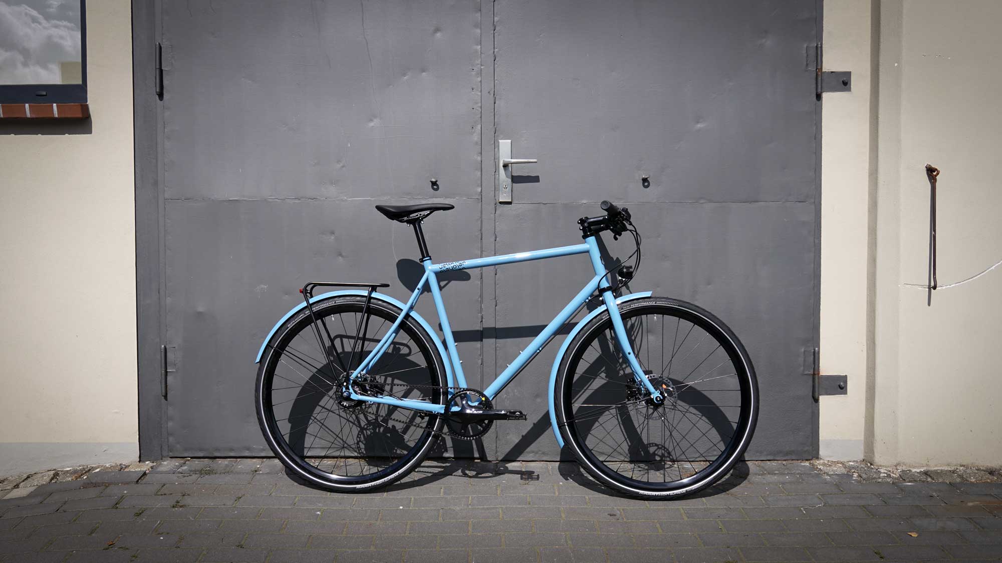 Pastellblau, wie der Sommerhimmel – ein veloheld.lane Urbanbike / Touringbike in der Wunschfarbe RAL 5024. Verbaut wurden am Stahlrahmen in Größe L die Serienkomponenten mit dem wartungsarmen Gates Carbon Drive Riemenantrieb, Shimano Alfine 11-Gang Nabenschaltung, integrierten Tubus Gepäckträger und der superhellen SON Beleuchtung.
