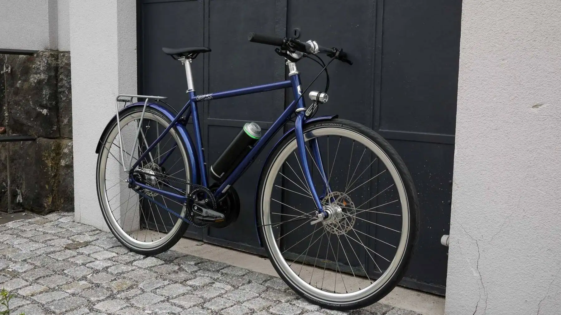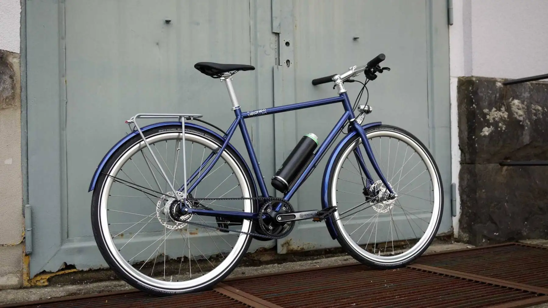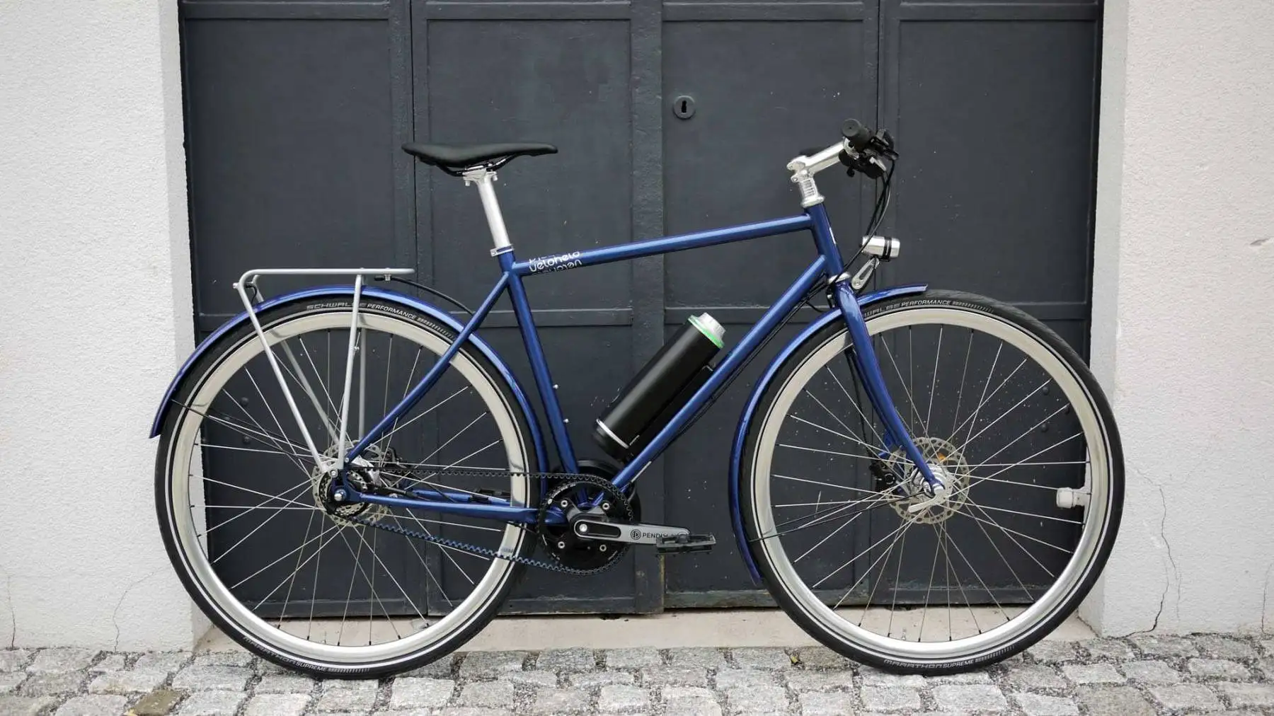 …für alle, die etwas Unterstützung beim Radeln wollen – unser veloheld.lane gibt es seit Kurzem auch als Pedelec. Und dies natürlich auch in Wunschfarbe und Ausstattung, wie dieses veloheld.e-lane in Perlnachtblau (RAL 5026) in Größe S mit silbernen Komponenten. Bis 25 km/h unterstützt der Pendix Antrieb mit dem sicherlich schönsten Akku für Stahlrahmen. In Verbindung mit dem wartungsarmen Gates Riemenantrieb und der 11-Gang Shimano Alfine Nabe ist das Rad perfekt für den Stadtbetrieb ausgestattet.