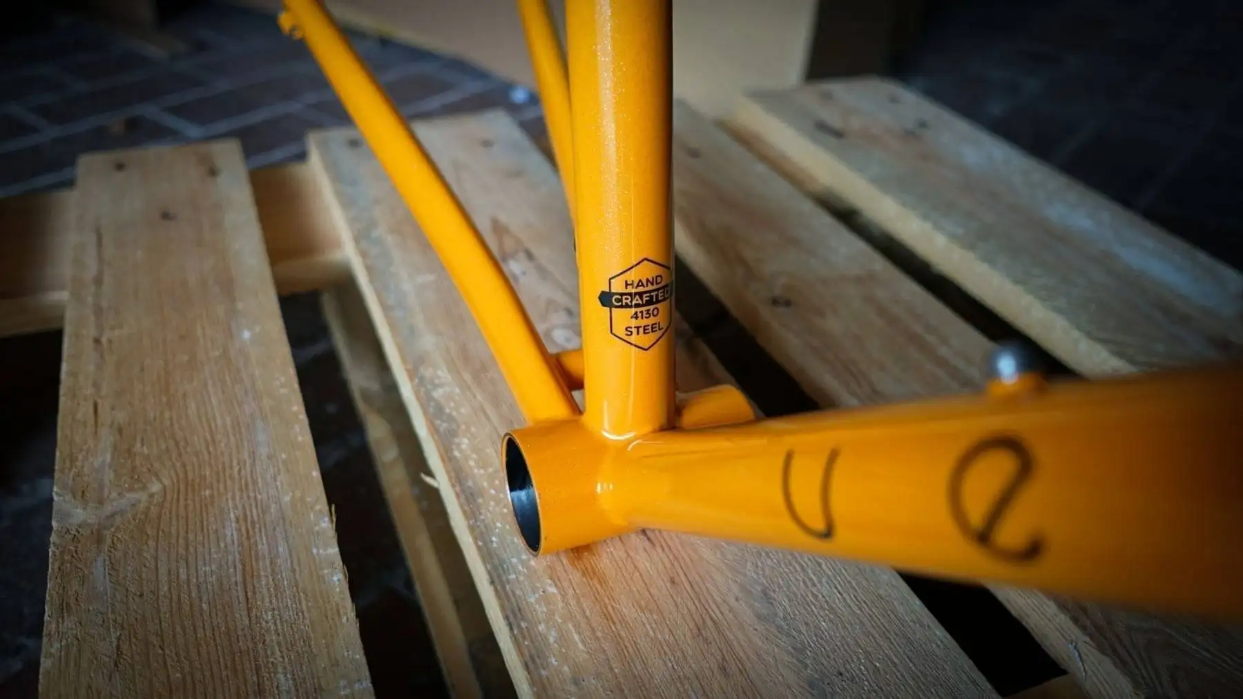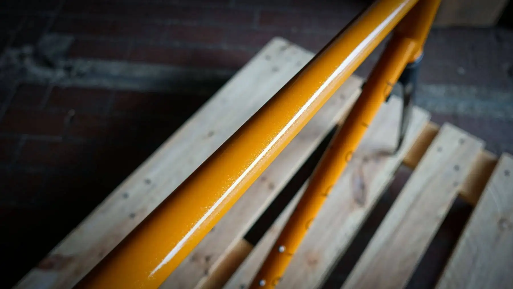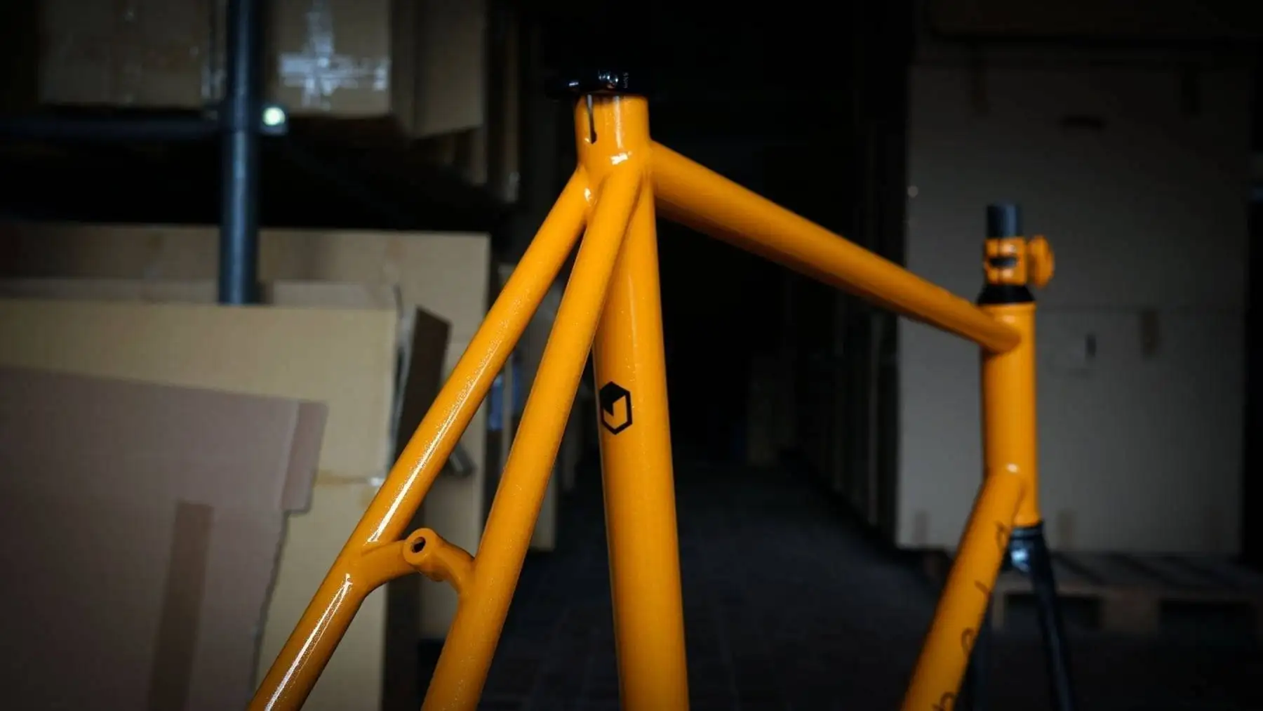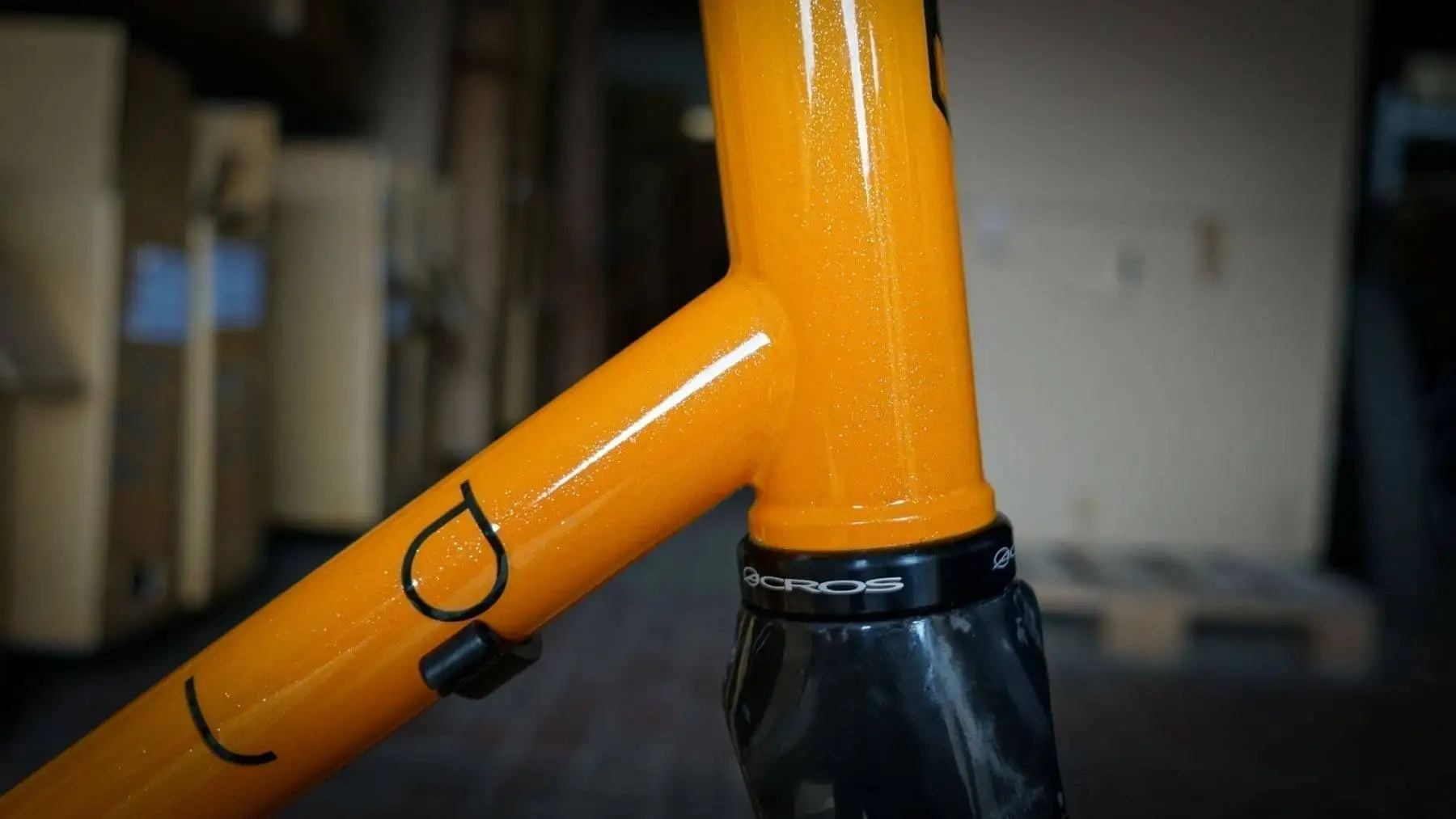 Das funkelt! Bei diesem veloheld.icon Rennrad Rahmenset für unseren Händler „Schicke Mütze“ in Düsseldorf wurde tief in die Beschichter-Trickkiste gegriffen. Zur Grundfarbe Tieforange (RAL 2011) gab es noch eine klare Beschichtung mit etwas silbernen Glitter drin für Rahmen und Vorbau. Ab sofort können wir dies für alle RAL-Farben mit silbernen oder goldenen „Flakes“ anbieten. Doch Achtung, dass Ergebnis ist ein wenig mit Überraschung verbunden. Wir können Euch nicht genau sagen, wie das Ergebnis wird…