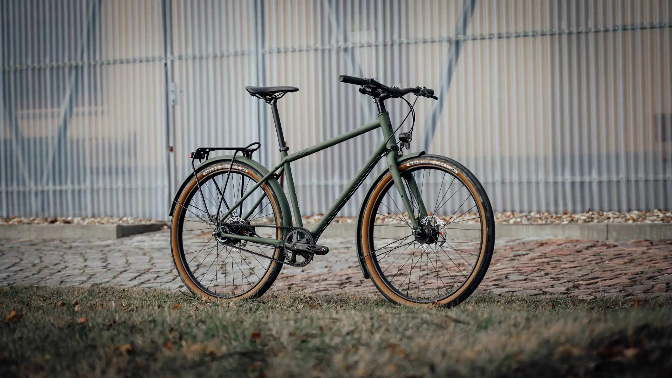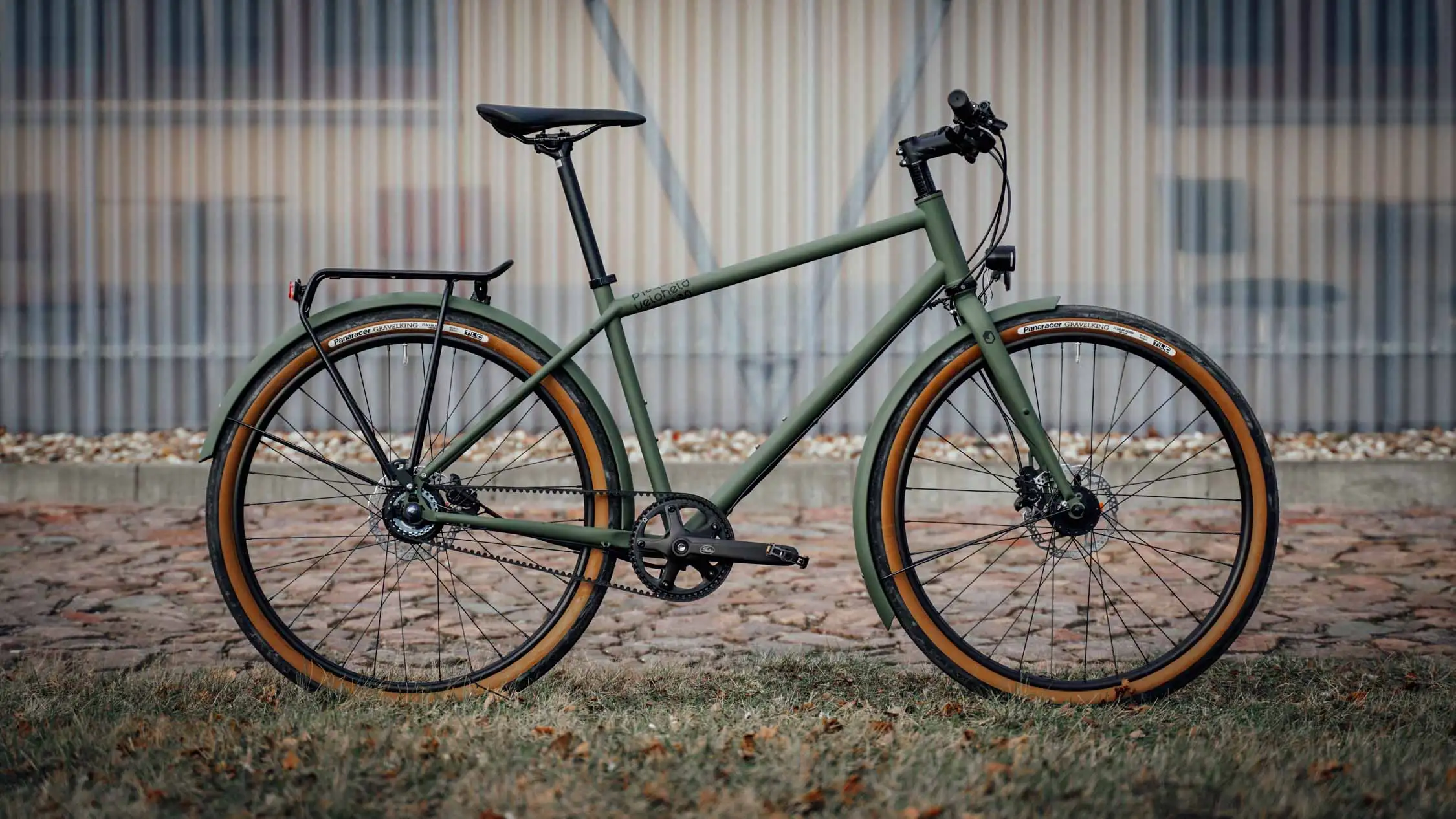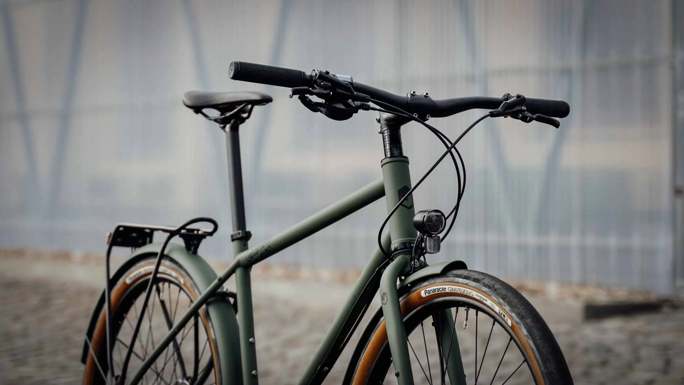 Ein veloheld.path nach unserem Geschmack! Das robuste Stadtrad in mattem Olivgrün (RAL 6003) steuert stilvoll und gelassen durch die Stadt und deren diverse Straßenbeläge.
