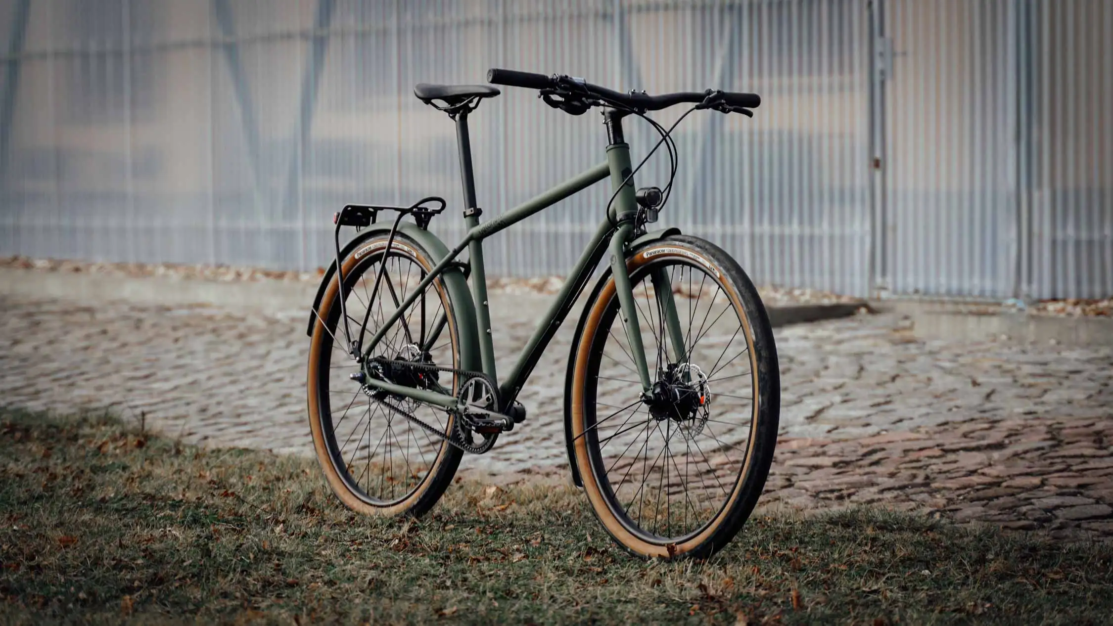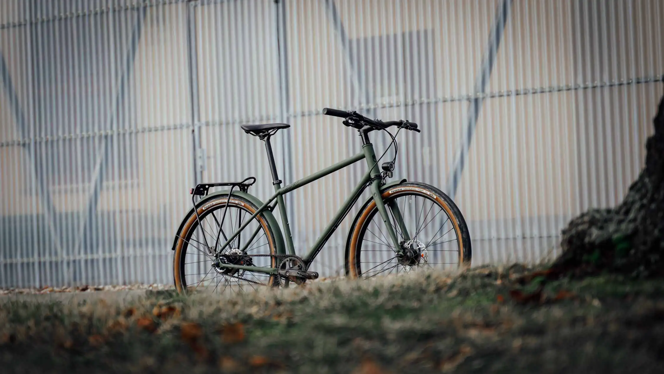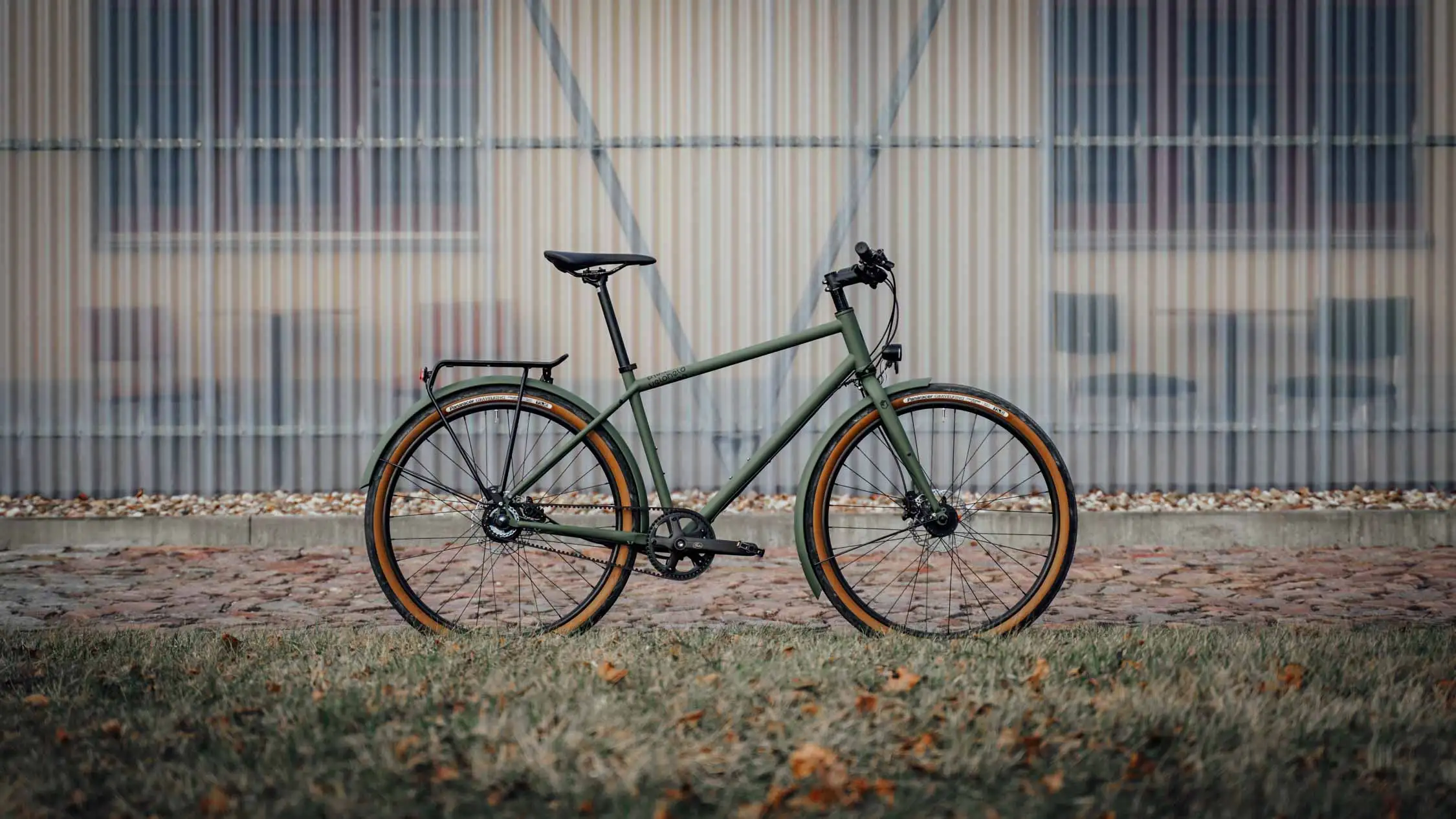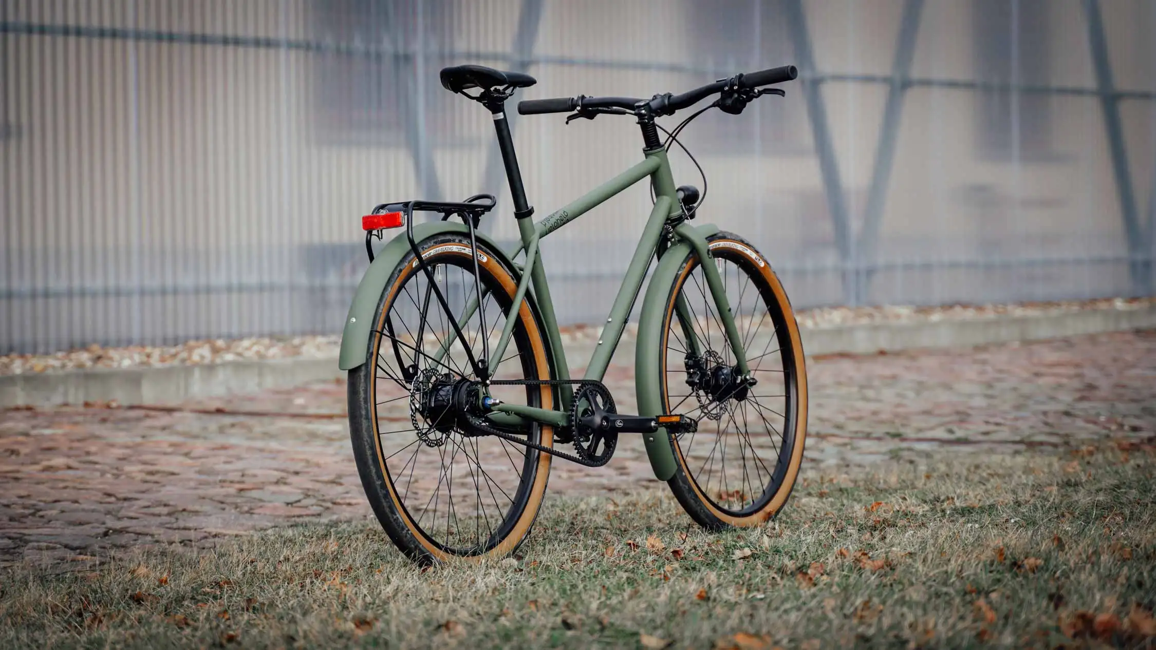 Ein veloheld.path nach unserem Geschmack! Das robuste Stadtrad in mattem Olivgrün (RAL 6003) steuert stilvoll und gelassen durch die Stadt und deren diverse Straßenbeläge.