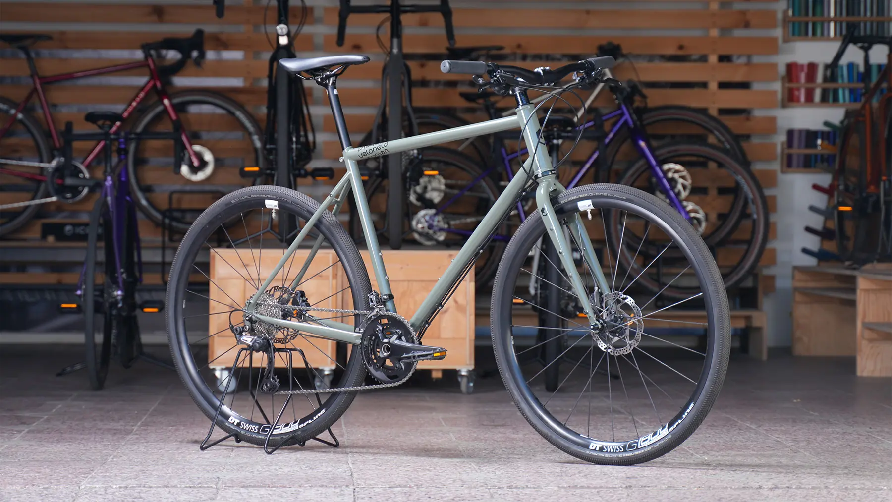- Ausstellungs-/Testrad (mit leichten Nutzungsspuren) mit Stahlgabel in Größe L in der RAL-Farbe 7009 „Grüngrau“ glänzend mit Dekor in schwarz