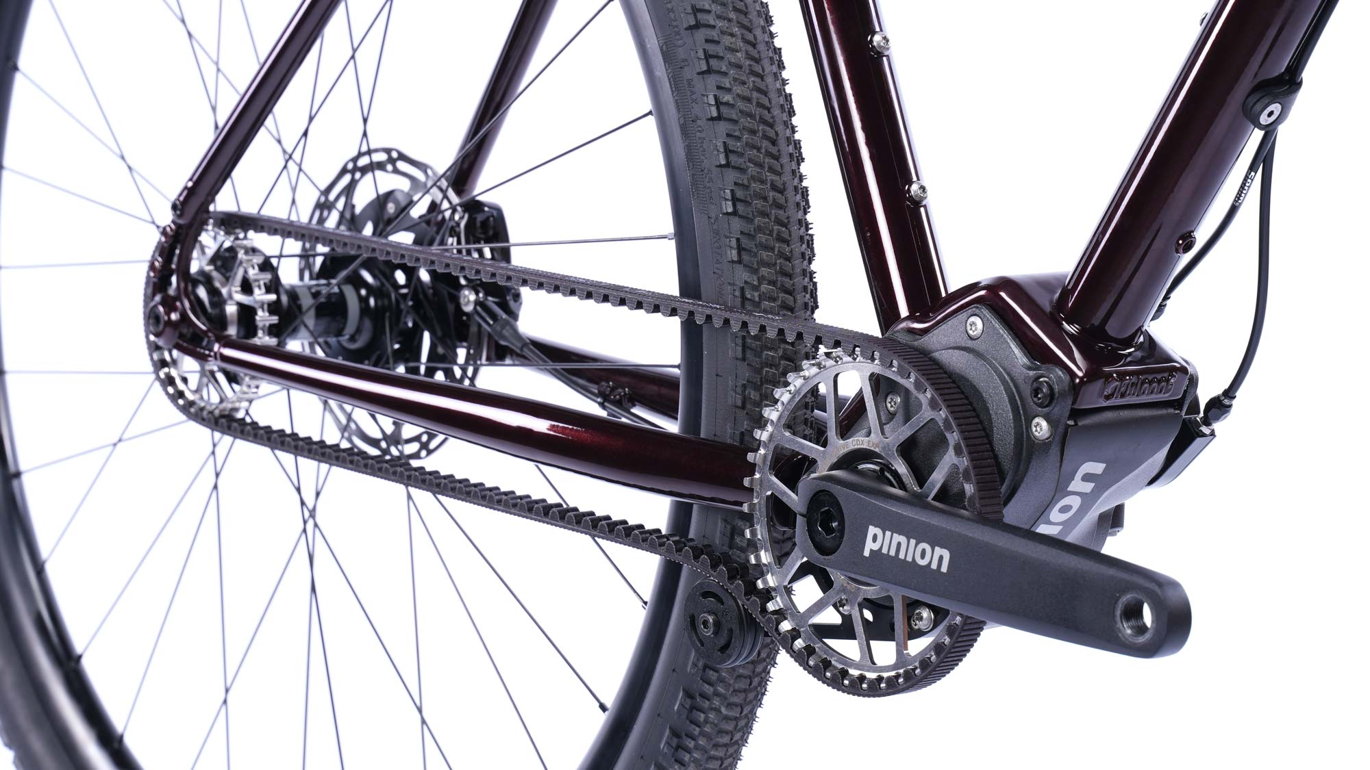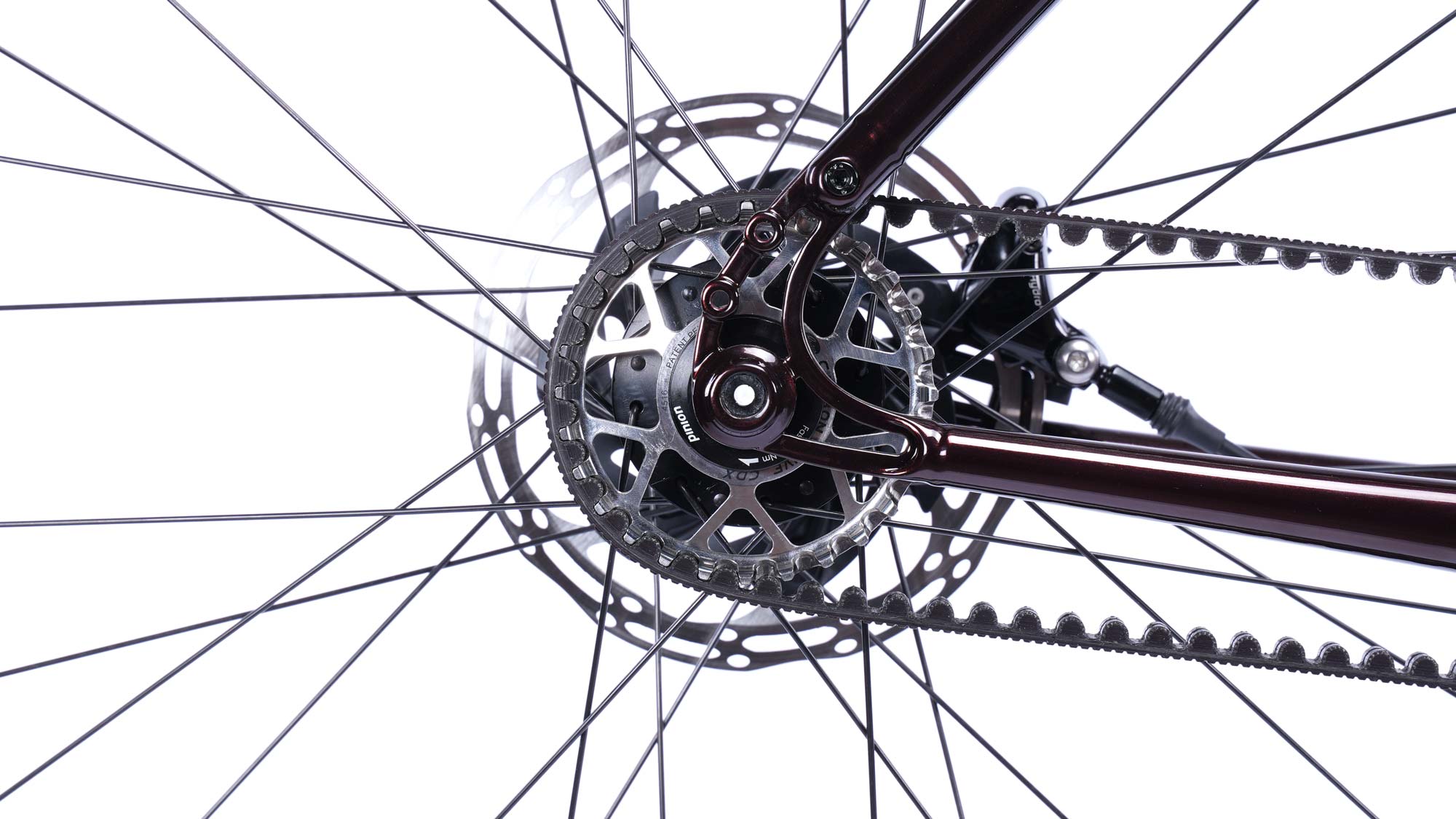 Um das enorme Drehmoment des Piniongetriebes über den Gates Riemen effizient auf das Hinterrad zu übertragen, wird der Antrieb direkt hinter der vorderen Riemenscheibe gespannt – die stabilste Lösung für einen antrittssteifen Rahmen