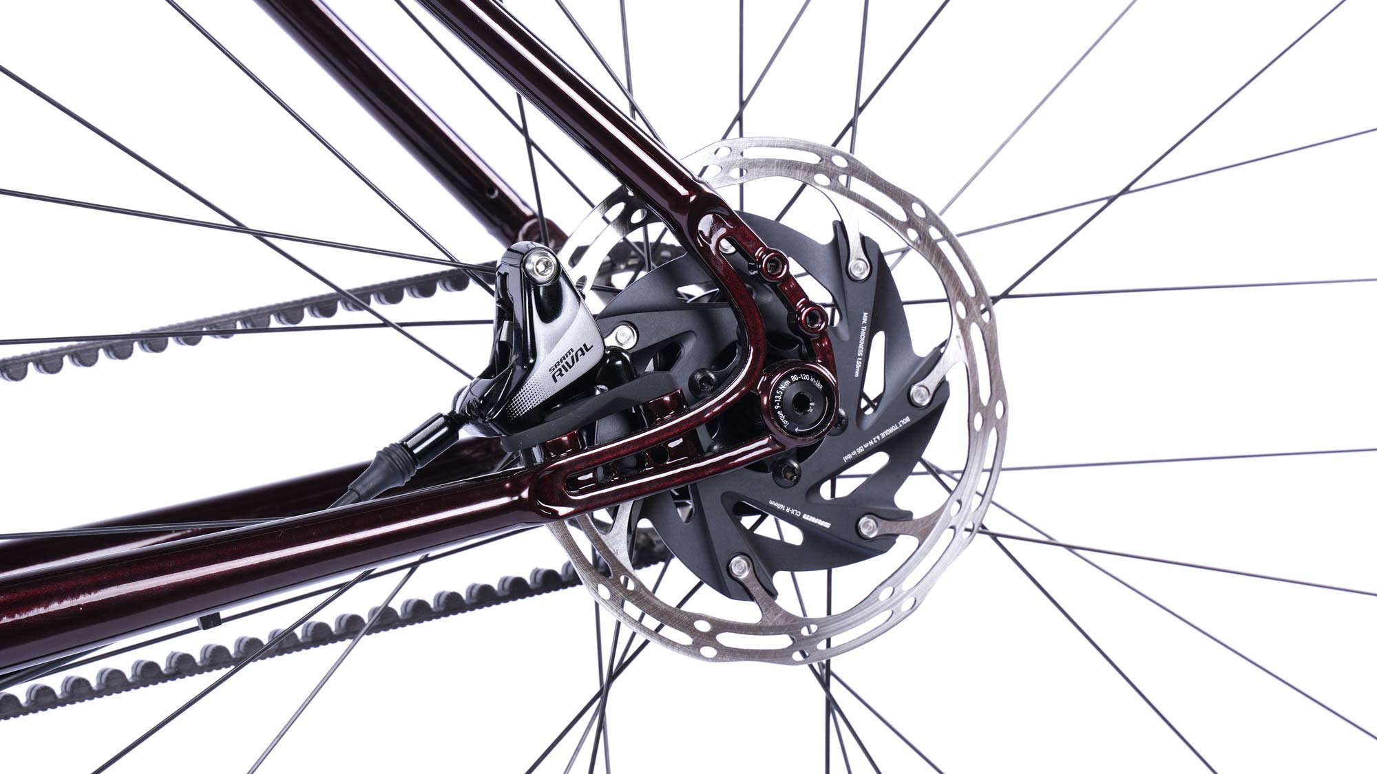 doppelt endverstärkte Rohre aus 4130 CrMoly (25CrMo4) Stahl, WIG-geschweißt, stabiles 44 mm Steuerrohr, Edelstahl Steckachs-Ausfallenden mit innenliegender Flatmount-Scheibenbremsaufnahme und Vorbereitung für KSA 18 Seitenständeraufnahme (mit Adapter), Rahmenschloss am Ausfallende für Gates Carbon Drive, im Unterrohr geführte Bremskabelverlegung, Pinionschaltkabel außenliegend, 3 Flaschenhalteraufnahmen, Ösen auf dem Oberrohr für die feste Montage einer kleinen Tasche