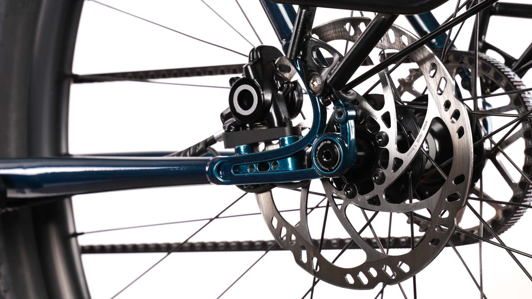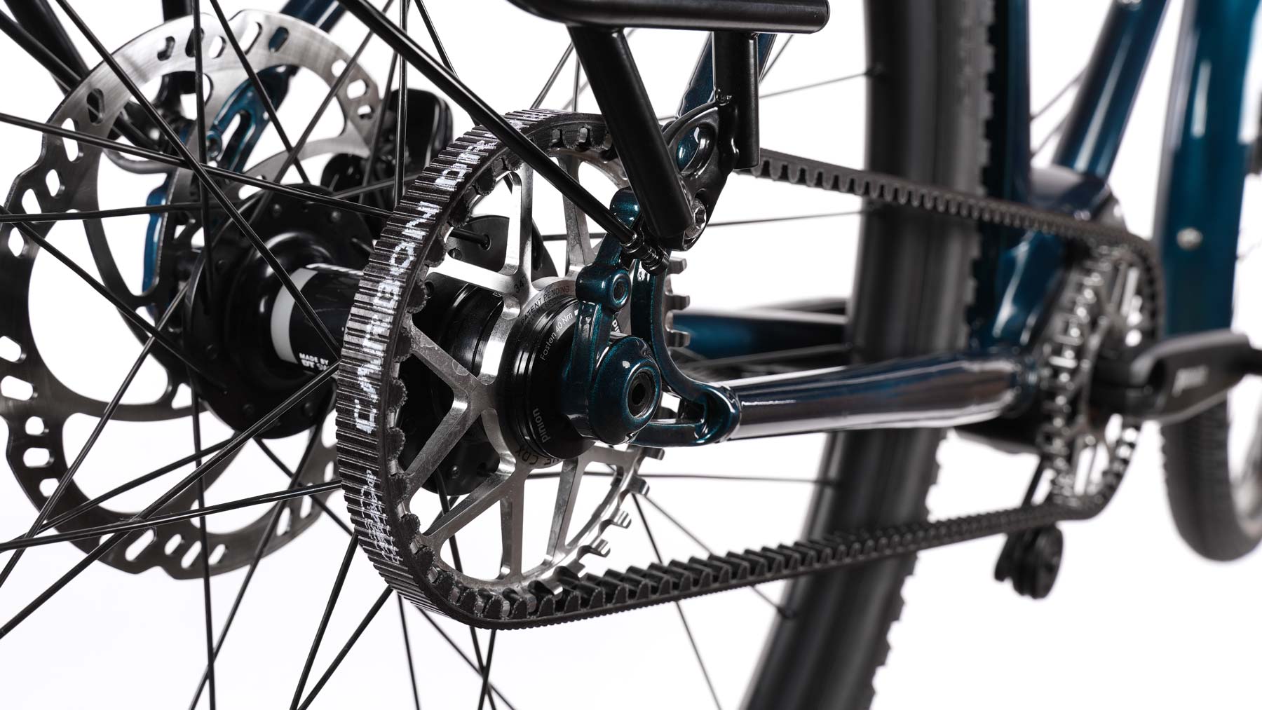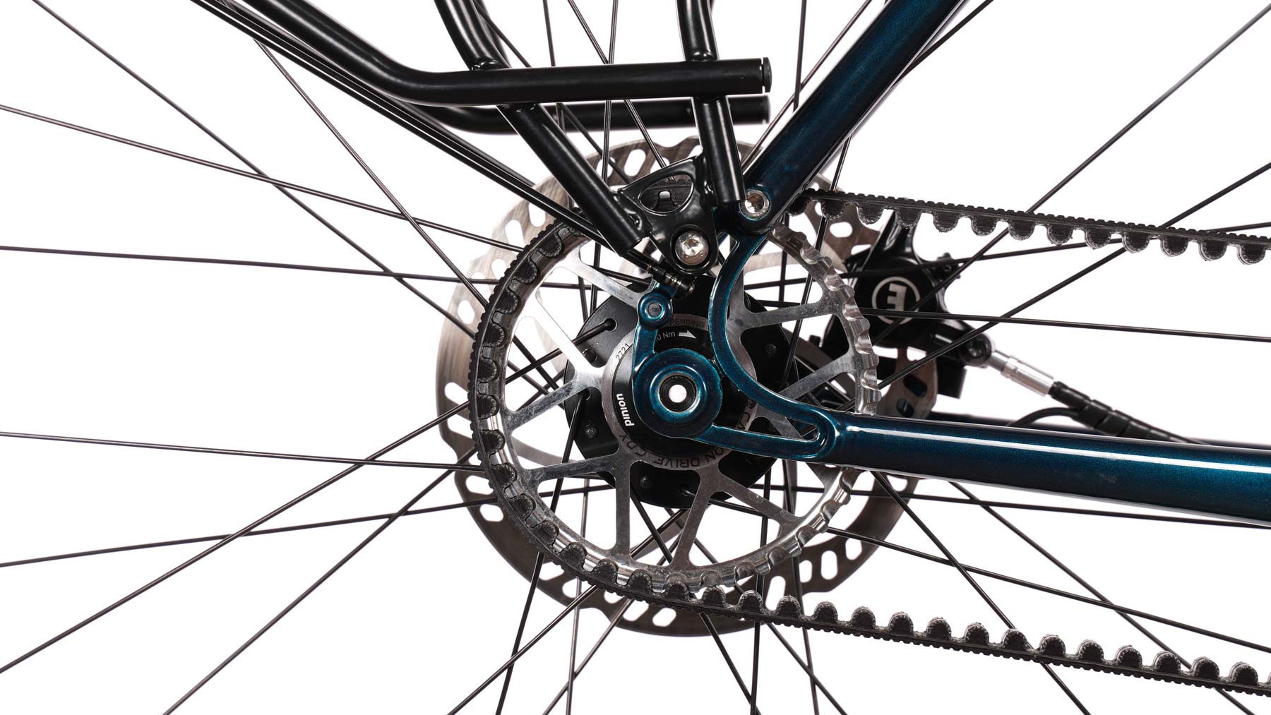 Um das enorme Drehmoment des Piniongetriebes über den Gates Riemen effizient auf das Hinterrad zu übertragen, wird der Antrieb direkt hinter der vorderen Riemenscheibe gespannt – die stabilste Lösung für einen antrittssteifen Rahmen