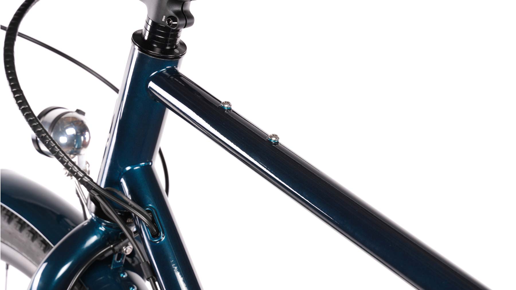 doppelt endverstärkte Rohre aus 4130 CrMoly (25CrMo4) Stahl, WIG-geschweißt, stabiles 44 mm Steuerrohr, Edelstahl Steckachs-Ausfallenden mit innenliegender Flatmount-Scheibenbremsaufnahme und Vorbereitung für KSA 18 Seitenständeraufnahme (mit Adapter), Rahmenschloss am Ausfallende für Gates Carbon Drive, im Unterrohr geführte Bremskabelverlegung, Pinionschaltkabel außenliegend, 3 Flaschenhalteraufnahmen, Ösen auf dem Oberrohr für die feste Montage einer kleinen Tasche