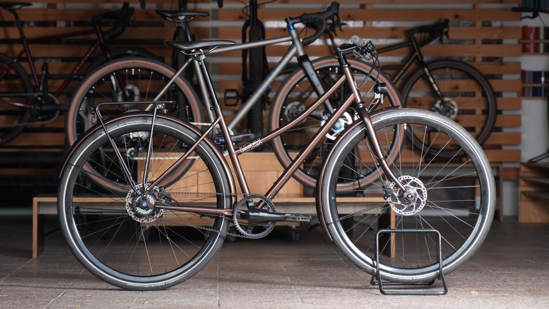 - doppelt endverstärkte Rohre aus veloheld.CrMo Stahl, WIG-geschweißt, 46mm Steuerrohr, Di2 ready, im hinteren Rahmendreieck liegende Flatmount-Scheibenbremsaufnahme für 160 mm Bremsscheiben