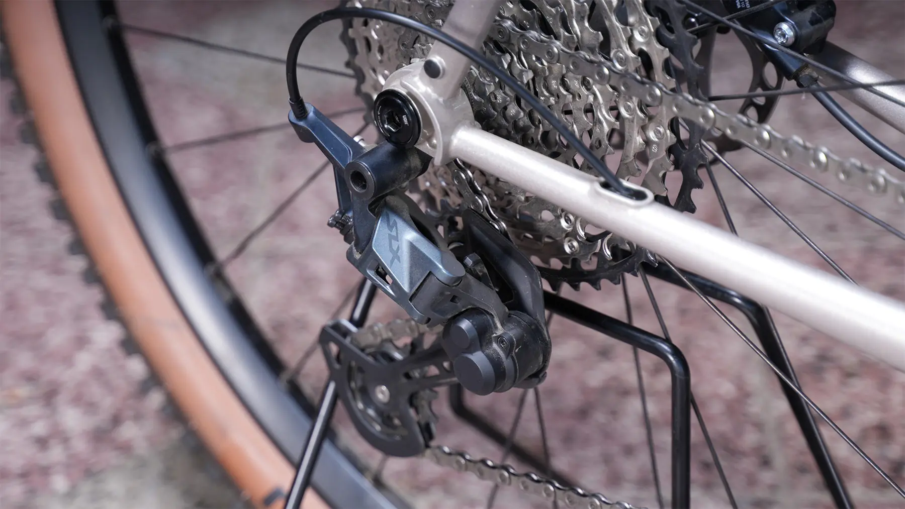 - Rahmen:doppelt endverstärkte und größenspezifische Rohre aus Reynolds 853 DZB (Ober und Unterrohr) und 25CrMo4 Stahl, WIG-geschweißt, 44mm Steuerrohr, 3D gedruckte Logo-Bremsaufnahme aus Edelstahl, SRAM UDH Schaltauge, T47 Innenlagergehäuse, ab Unterrohr bis in die Kettenstreben integrierte Brems- und Schaltkabelführung, interne Dropper-Post Kabelführung im Sitzrohr möglich, im hinteren Rahmendreieck liegende Flatmount-Scheibenbremsaufnahme für 160 mm Bremsscheiben, Montageösen für 3 Flaschenhalter + 1 Taschenhalterung auf dem Oberrohr