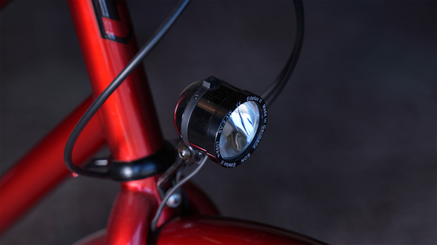 - Ausstellungs-/Testrad (mit leichten Nutzungsspuren) mit SON-Lichtanlage, Stahlgabel, Schutzblechen und Gepäckträger in Größe L in der Farbe „Candy Red“ glänzend mit Dekor in silber