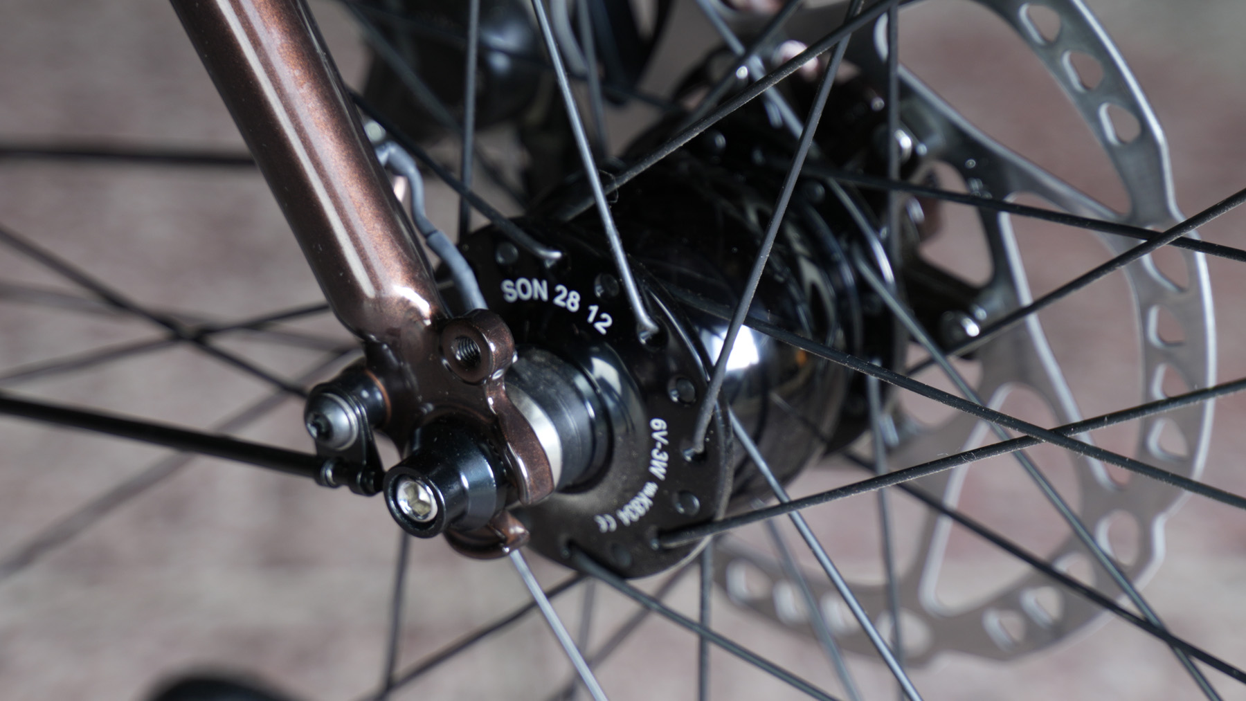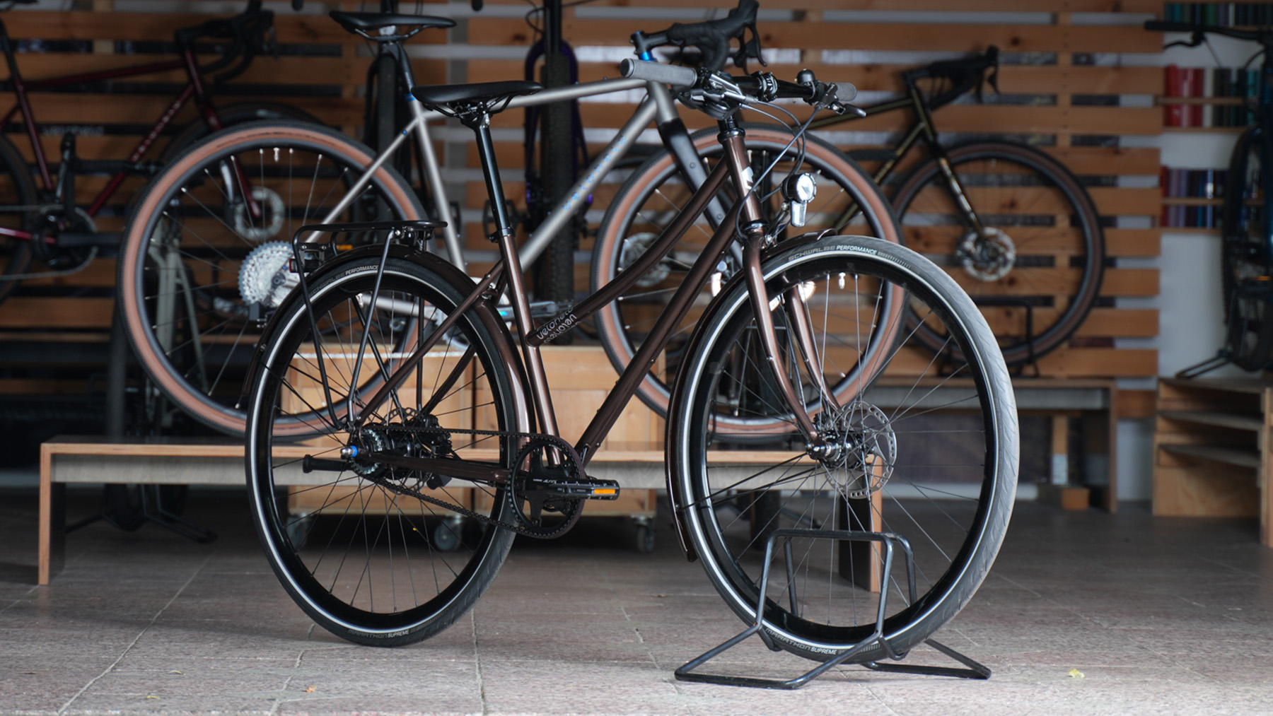 - Ausstellungs-/Testrad (mit leichten Nutzungsspuren, kleine Delle auf Oberrohr) mit SON-Lichtanlage, Stahlgabel, Schutzblechen und Gepäckträger in Größe S in der Farbe „Misty Copper“ glänzend mit Dekor in silber