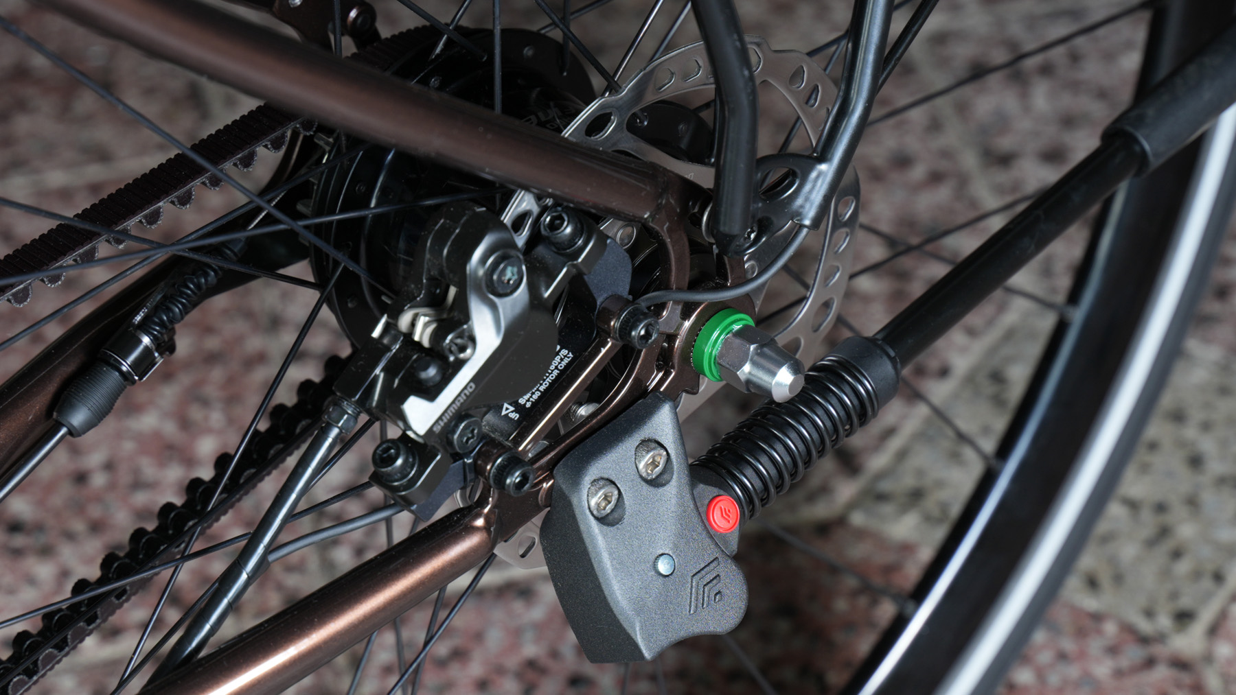 - Rahmen: doppelt endverstärkte Rohre aus 4130 CroMoly Stahl, WIG-geschweißt, EBB-Exzenter Innenlagergehäuse zum Spannen des Riemens, Edelstahl Ausfallenden mit innenliegender Scheibenbremsaufnahme und KSA 18 Seitenständeraufnahme