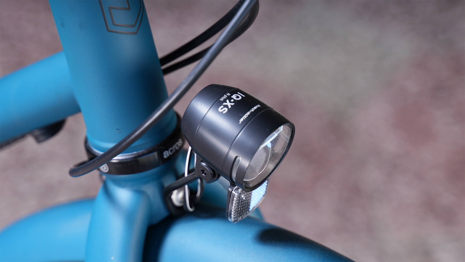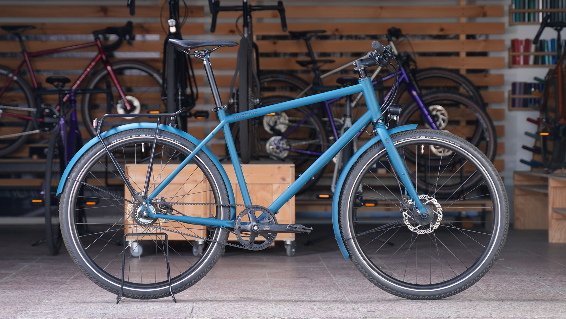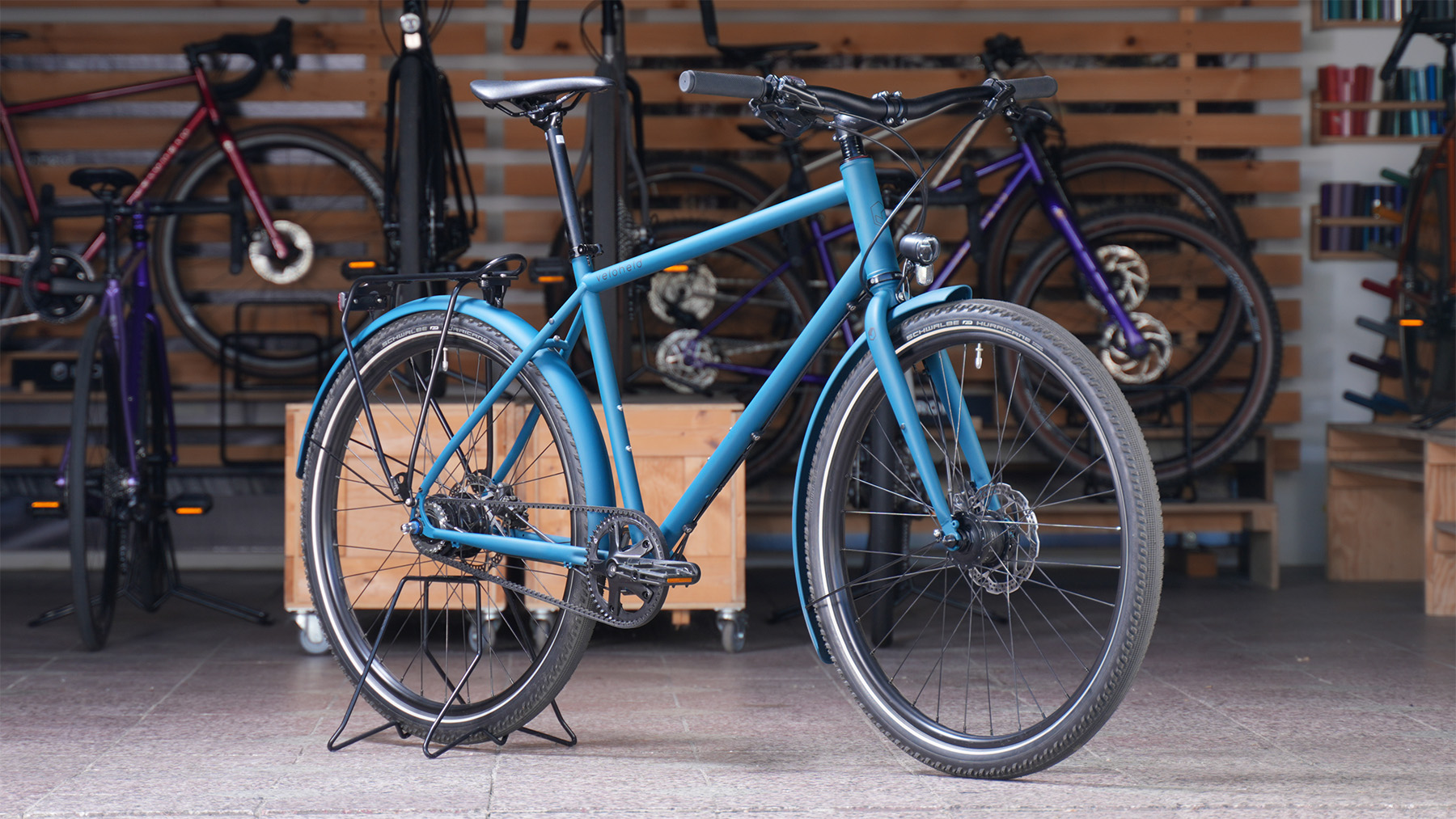 - Ausstellungs-/Testrad (mit leichten Nutzungsspuren) inkl. Busch&Müller-Lichtanlage, Stahlgabel, Schutzblechen und Gepäckträger in Größe L in der RAL-Farbe 5020 „Ozeanblau“ matt mit Dekor in schwarz