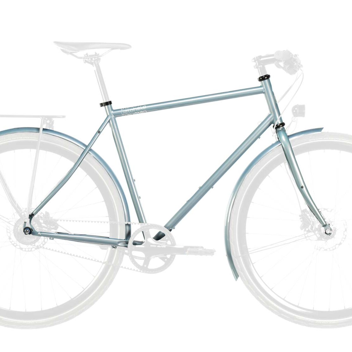 - Gabel: doppelt endverstärkte Rohre aus 4130 CroMoly, 1 1/8″ – 1 1/2″ Steuerrohr, Ösen für Front-Gepäckträger