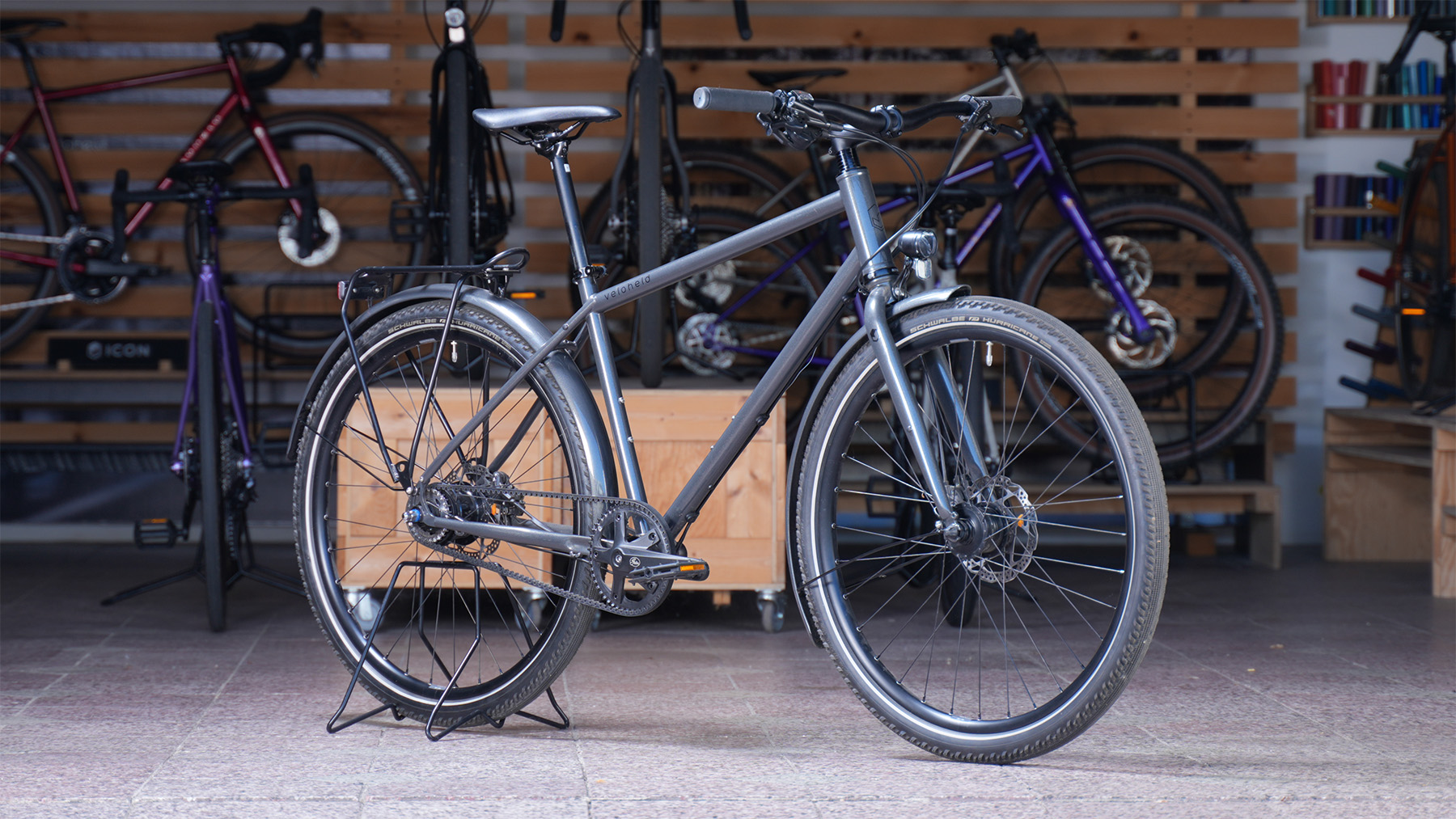 - Ausstellungs-/Testrad (mit leichten Nutzungsspuren) inkl. Busch&Müller-Lichtanlage, Stahlgabel, Schutzblechen und Gepäckträger in Größe M in der Farbe „Chrystal Grey“ glänzend mit Dekor in schwarz