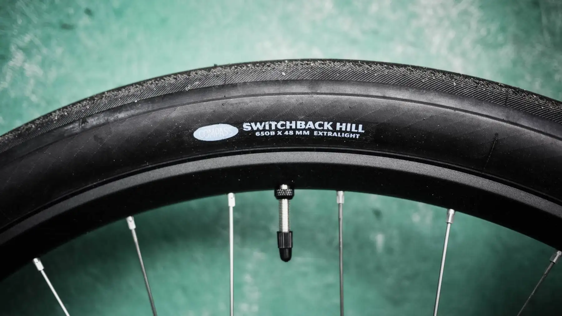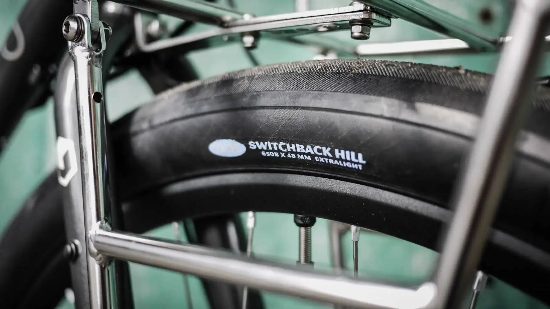 Unser Rad der Woche ist dafür perfekt geeignet. Auf Basis des grauen veloheld.iconX Cross- bzw Gravelbike-Rahmens in Größe L gab es eine Menge Wunschkomponeten. Fangen wir mal bei den Laufrädern an. Diese wurden extra für das Rad gebaut und bestehen aus einer Hope Nabe hinten und einem SON-Nabendynamo vorn in Verbindung mit DT-Swiss XR 361 Felgen in 650B oder auch 27,5″ Größe. Als Kontakt zu den unterschiedlichsten Untergründen, die das Rad bald zu sehen bekommt, rollt es auf komfortabel schnellen Compass Switchback Hill Reifen in 48 mm Breite.