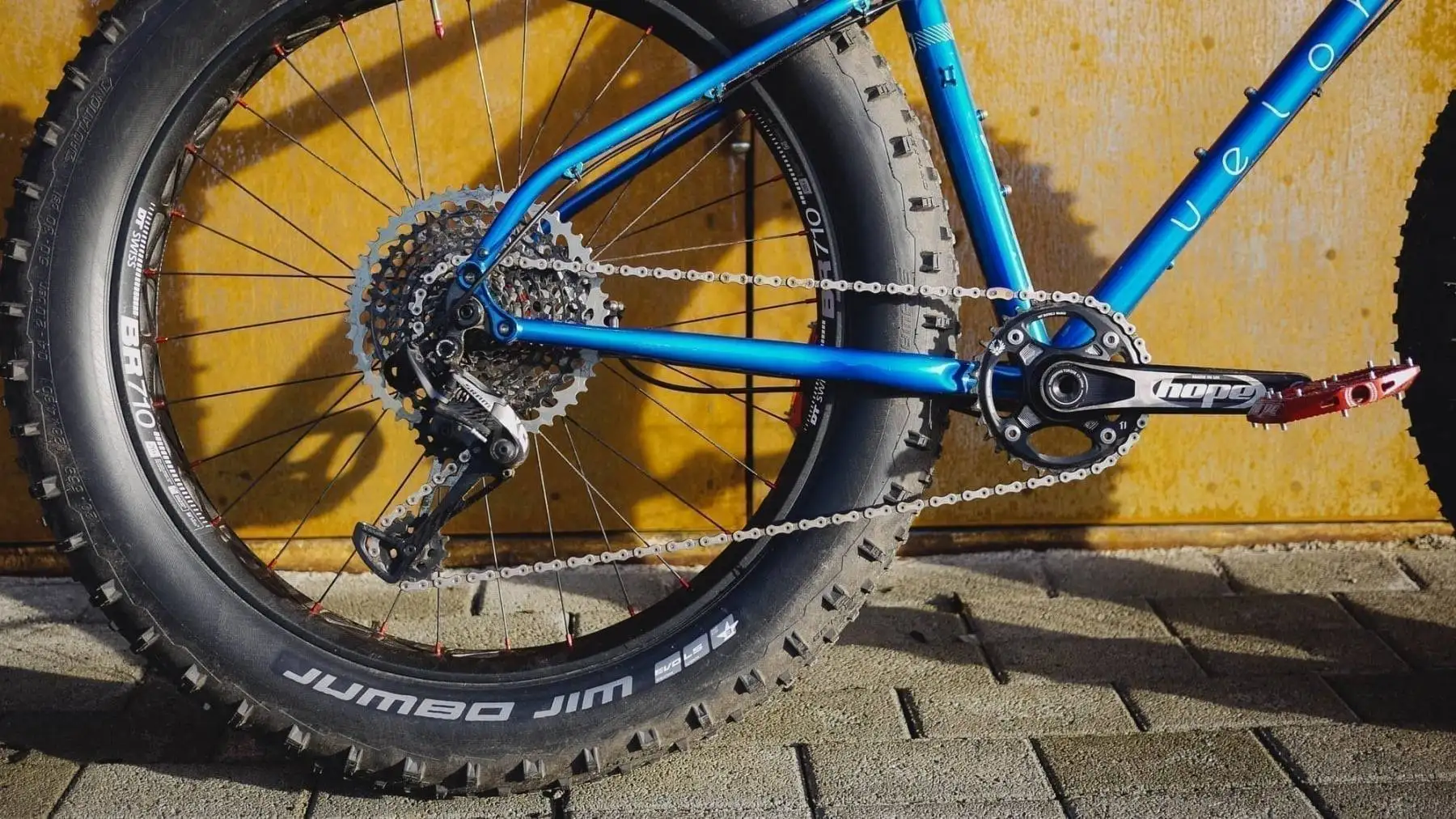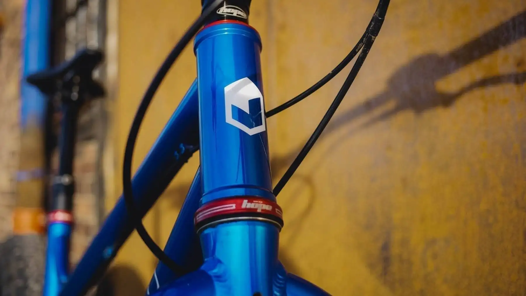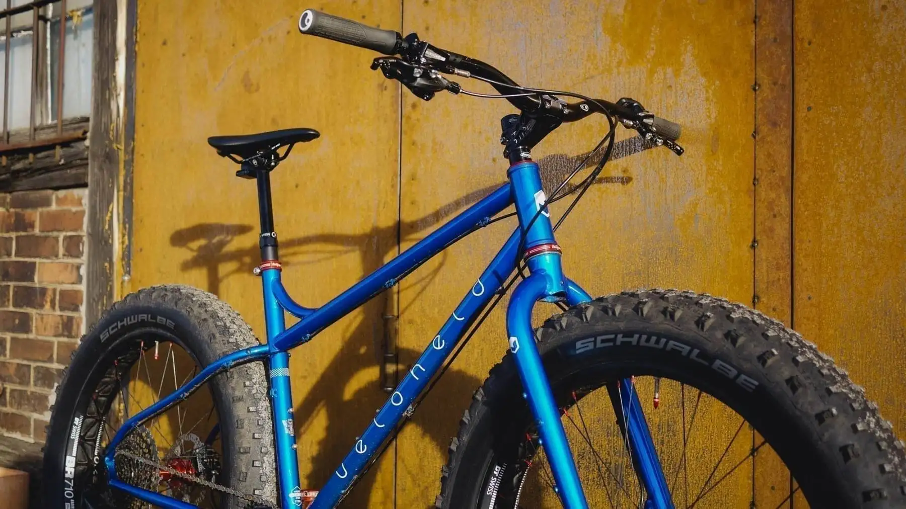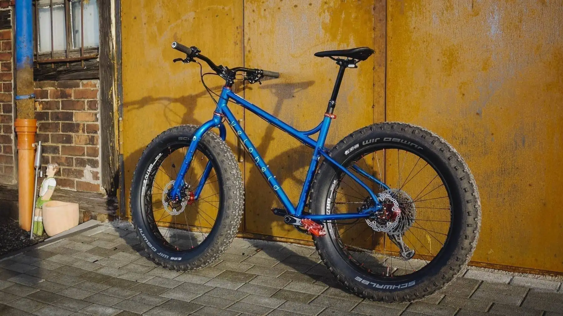 Für dieses veloheld.fat iron Fatbike stand „Optimus Prime“ aus der „Transformers“ Filmreihe Pate. So wurde der Rahmen und die Gabel in der Farbe „Anodized Blue“ pulverbeschichtet und mit einer Menge kontrastierender rot eloxierten Teile von Hope aufgebaut. Die Hope Pro4 Fatsno Naben, Steuersatz, Innenlager, Sattelklemme, Ventilkappen und die Nippel – alles in rot. Dazu gab es noch eine Menge schwarzer Wunschkomponenten, wie Hope Kurbeln, Bremsen und Vorbau, sowie ein Crank Bros Opium 3 Lenker, DT-Felgen auf denen 4.8″ breite Schwalbe Jumbo Jim Reifen sitzen. Ein Highlight am Rad ist sicherlich die kabellose Magura VYRON eLECT Sattelstütze. Mit einem kleinen Knopf am Lenker wird per Funk die Info zum „Hoch und Runter“ der Sattelstütze gegeben.