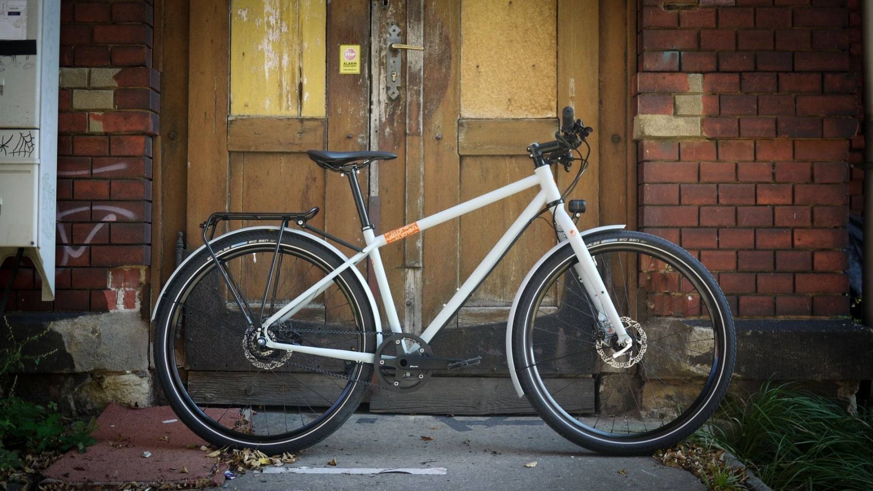 Eines unserer ersten veloheld.path Räder in Sonderfarbe. Der Rahmen in Größe M, sowie Gabel und Schutzbleche wurden in silbergrau matt oder auch RAL 7001 pulverbeschichtet. Das Dekor in orange wurde nachträglich aufgebracht, da die Gefahr bestand, dass es sich bei den hohen Temperaturen beim Pulverbeschichtungsprozess verfärben könnte. Die verwendeten Komponenten sind wie beim Serienrad veloheld.path – Shimano Alfine 8-Gang Hinterradnabe, Gates Carbon Drive Riemenantrieb, Supernova Beleuchtung und Racktime Gepäckträger. So ist das Rad bereit für eine etwas rauere Stadt! Viel Spaß dem neuen Besitzer damit! Vielleicht sieht man sich einmal auf einer schöne Kopfsteinpflasterstraße!